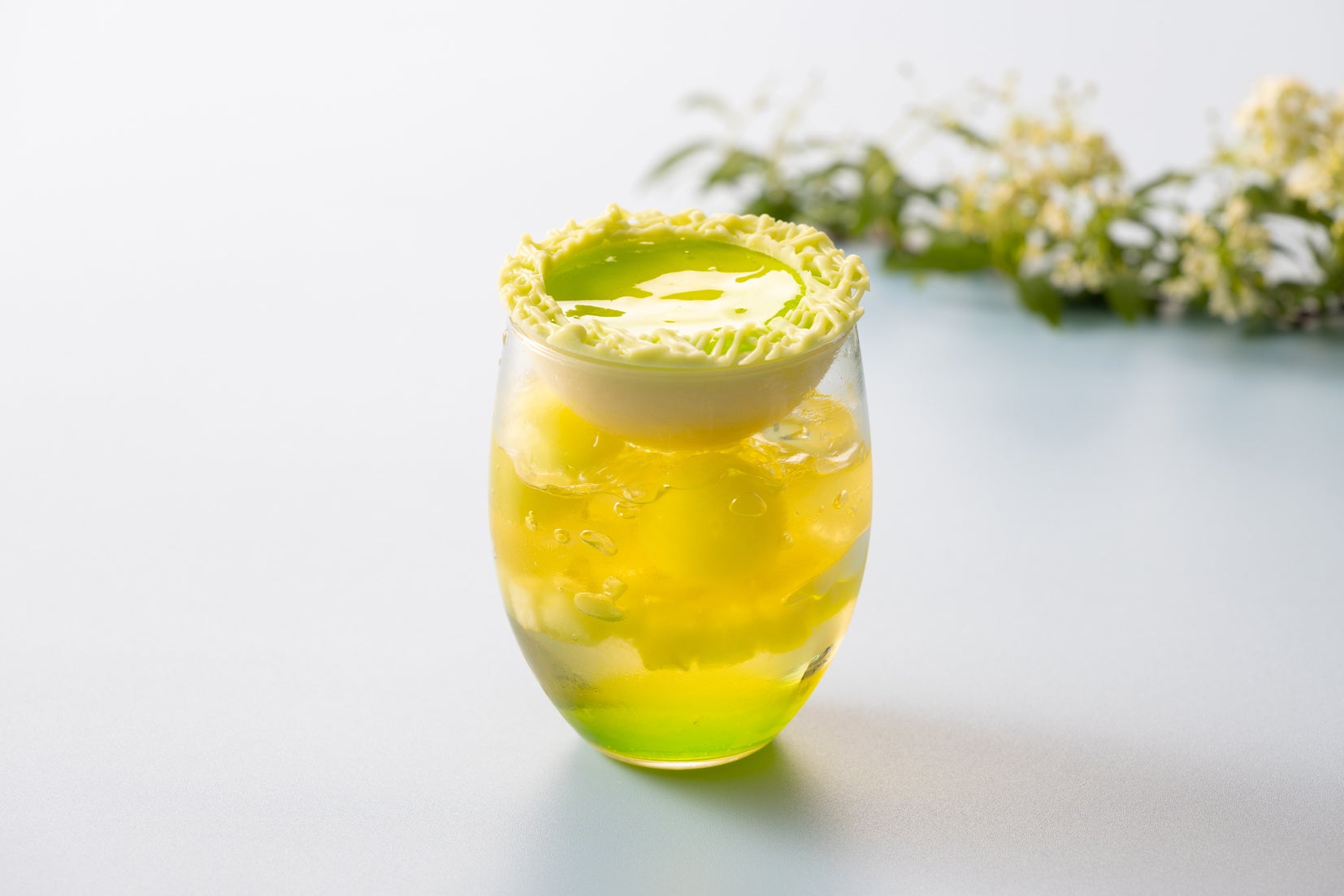 ボルドー地方でつくられる極甘口の貴腐ワイン「ソーテルヌワイン」の ゼリーに、丸くくり抜いたメロンとダイス状にカットしたメロンを浮かべ ます。グラスの上には、ホワイトチョコレートを器に見立てた濃厚なフ ロマージュブランのムースをトッピング。ムースだけでも、ゼリーと合わせても美味しくお召し上がりいただける、シェフの遊び心が満載の一品です。