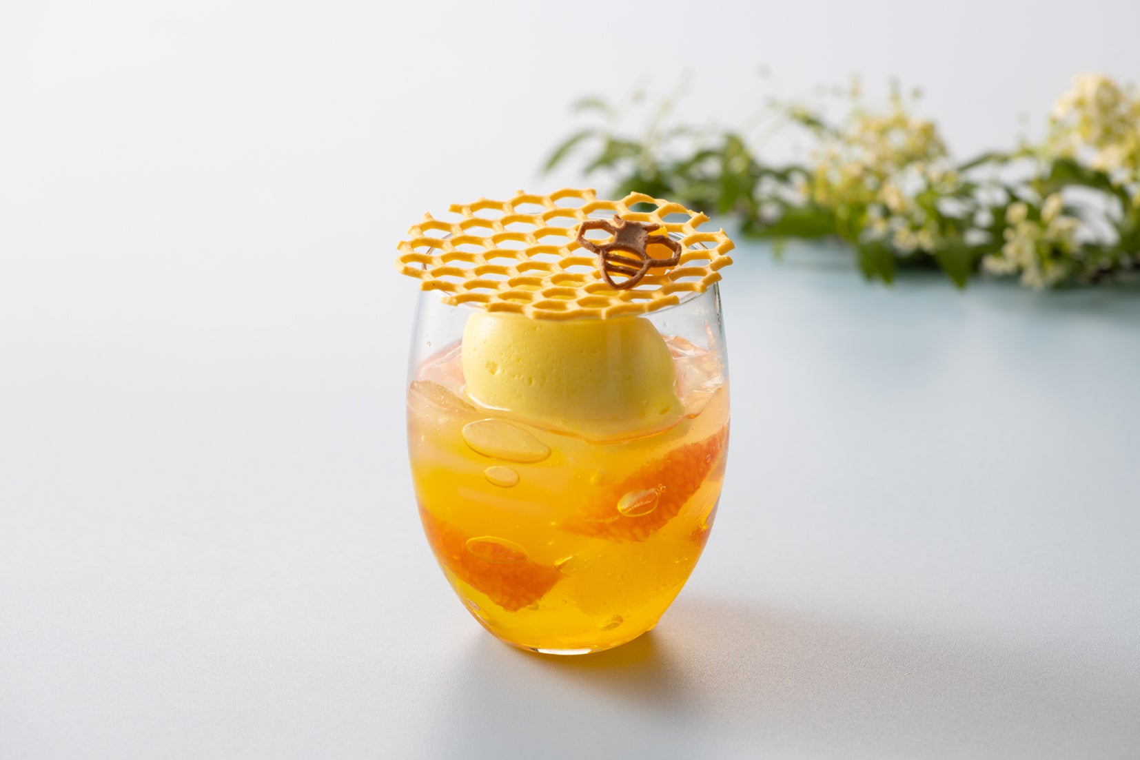毎年ご好評いただいているグランドハイアット東京の夏の定番ベリーヌです。フレッシュな桃にシュワっとしたスプマンテ(スパークリング ワイン)のゼリーを合わせました。桃の甘味とスッキリとしたスプマンテのゼリーが相性のいい、さっぱりとお召し上がりいただける一品です。繊細な飴細工と一緒にお楽しみください。