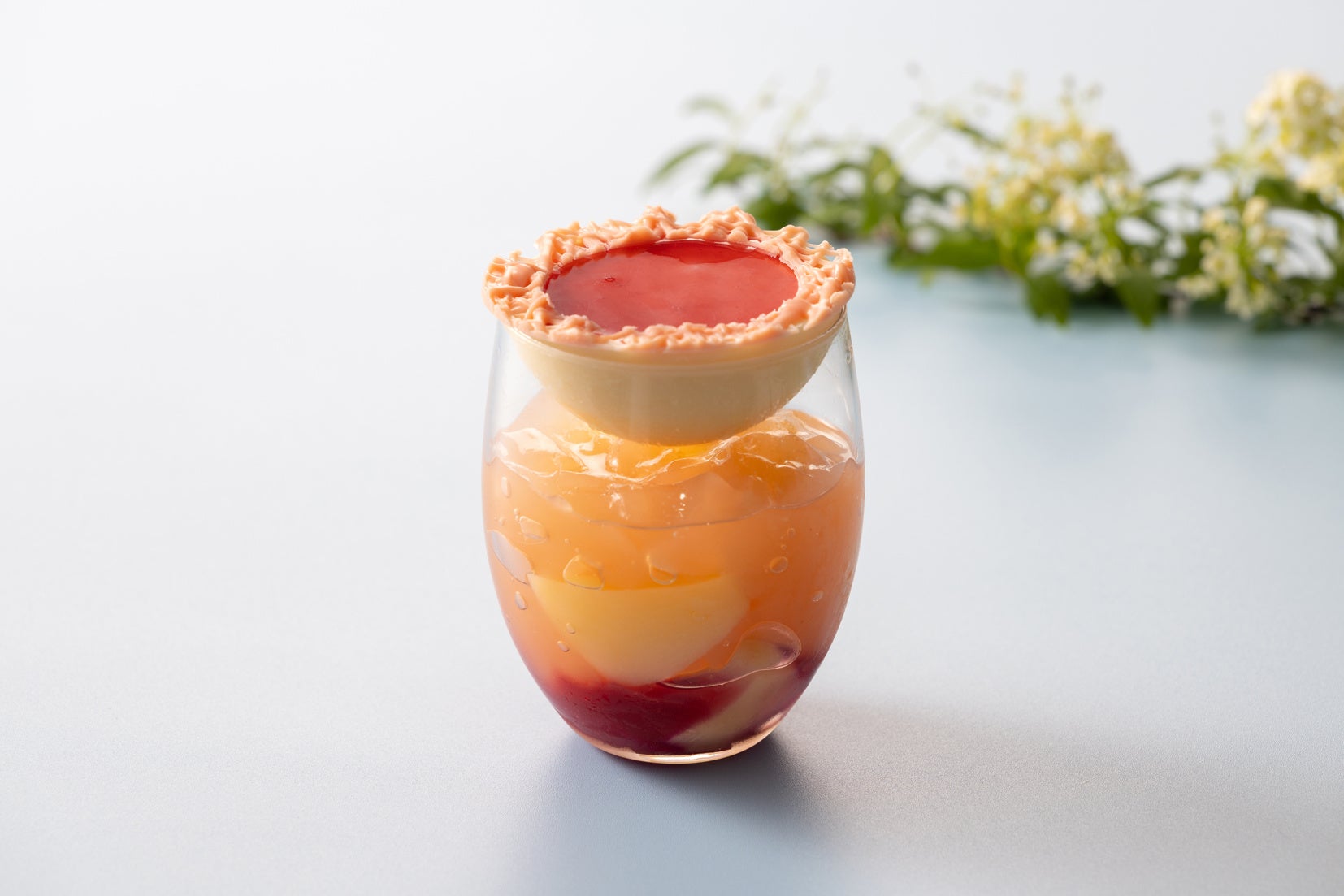 桃の果肉を浮かべた甘いピーチゼリーの下に、ハイビスカスとラズベリーのシロップを敷き、暑い夏でもさっぱりとお召し上がりいただけ るよう仕上げます。グラスの上に乗せる半球型のホワイトチョコレートには、優しい甘さのピーチムースを入れています。ムースだけでも、ゼリーと合わせても美味しくお召し上がりいただけるよう工夫しました。