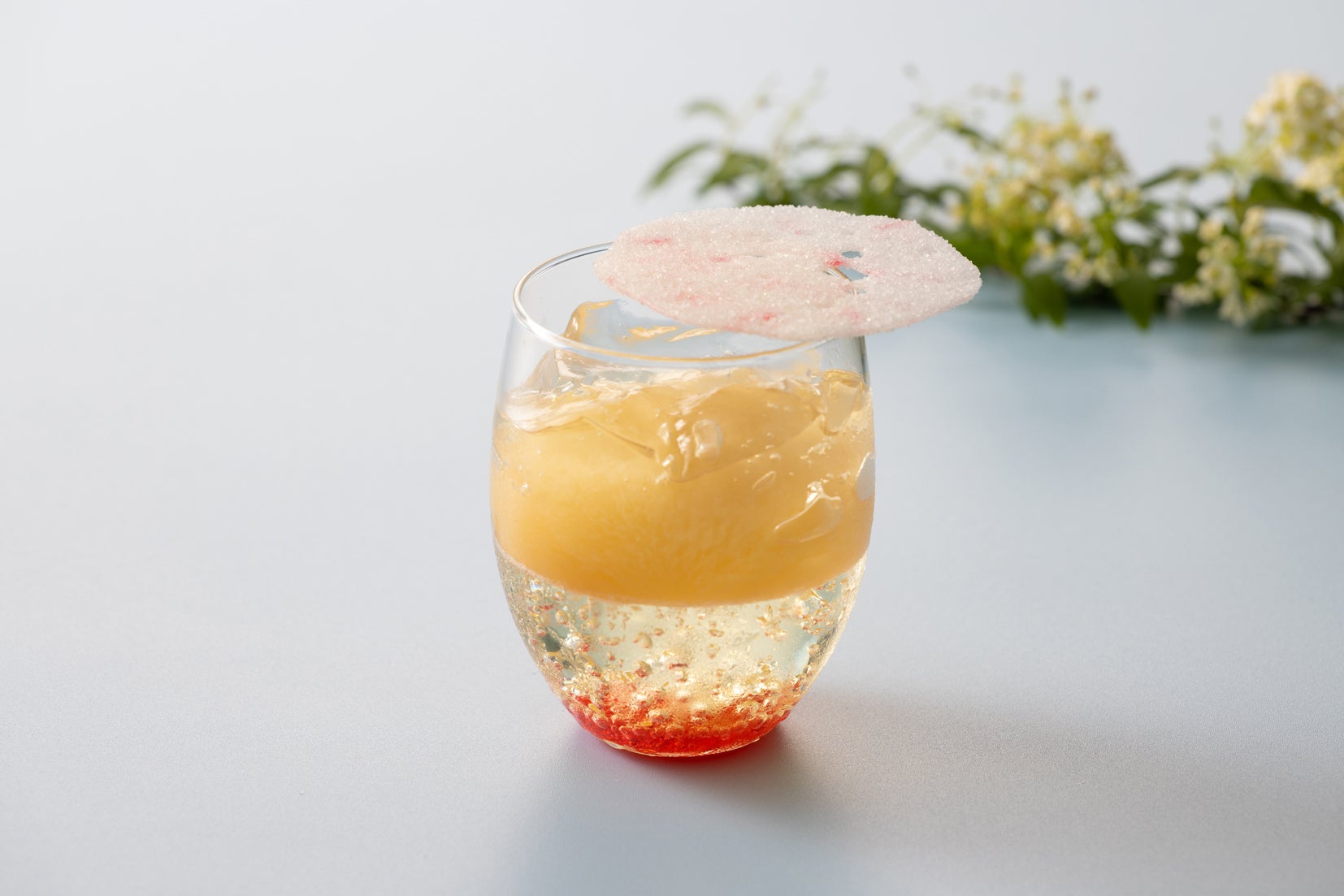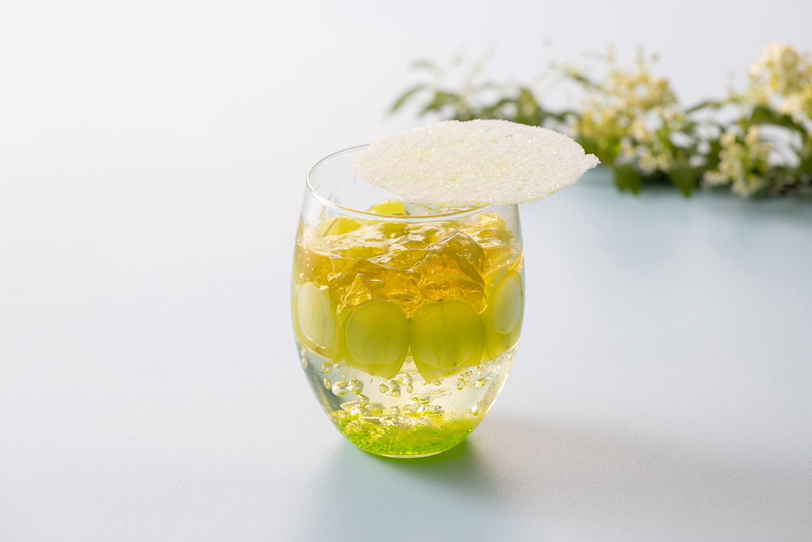 ノンアルコール スパークリングワインでつくったゼリーに、果粒が大きく甘いシャインマスカットを並べ、その上にシャルドネジュースのジュレをのせた爽やかな味わいのベリーヌです。食感のアクセントにも なる繊細な飴細工と一緒にお召し上がりください。