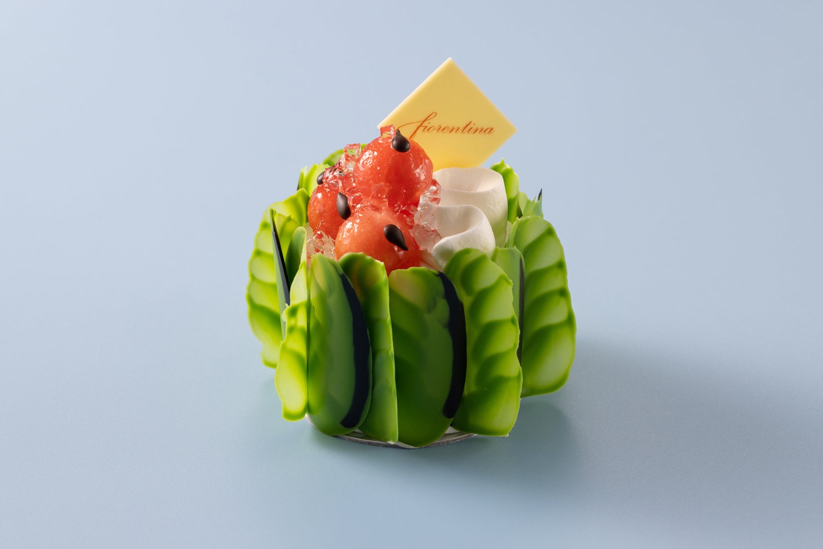夏の風物詩「スイカ」をつかい、スイカの皮や種に見立てたチョコレートのデコレーションを施し、味わいはもちろん見た目にもこだわり の詰まったケーキです。ふわふわのスポンジ生地でサンドしたスイカ に加え、くり抜いたスイカをトッピングし、スイカならではの甘味や食 感をお楽しみいただけます。