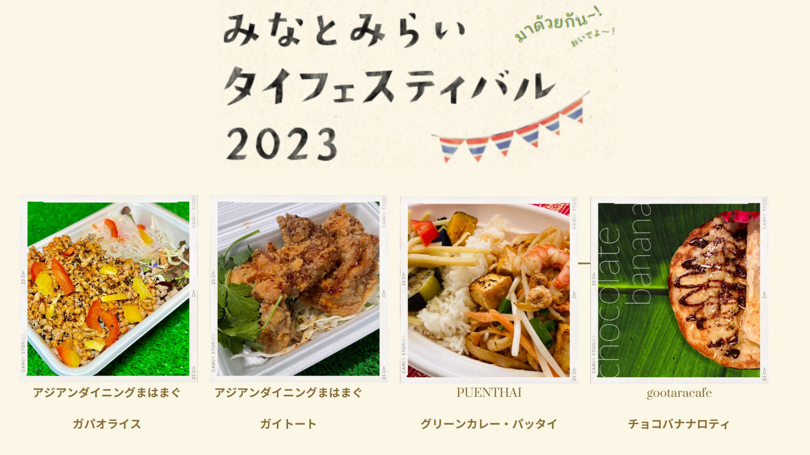 ガパオライス、ガイヤーンライス、ガイトート(タイ風唐揚げ)、タイ風かき氷 等