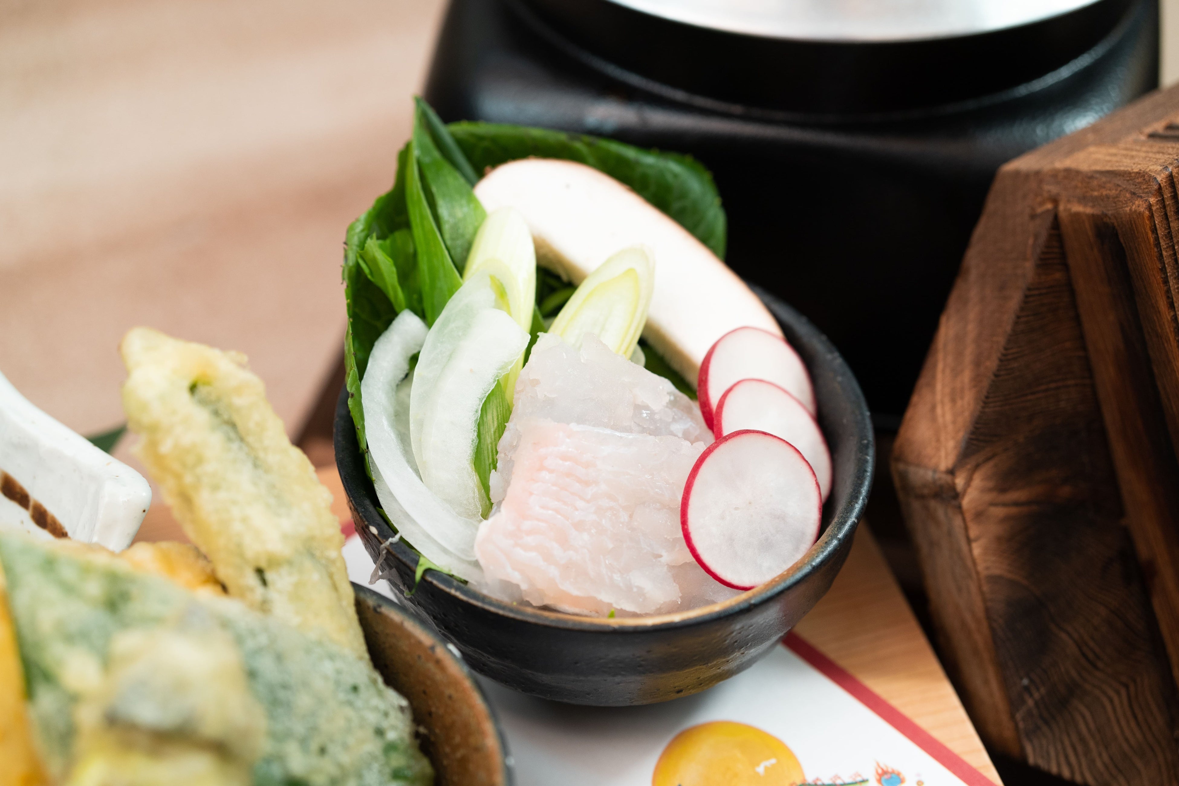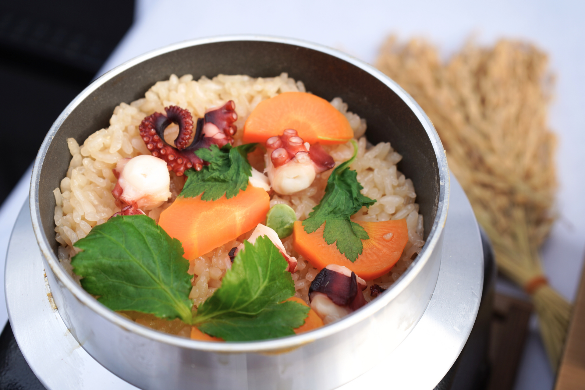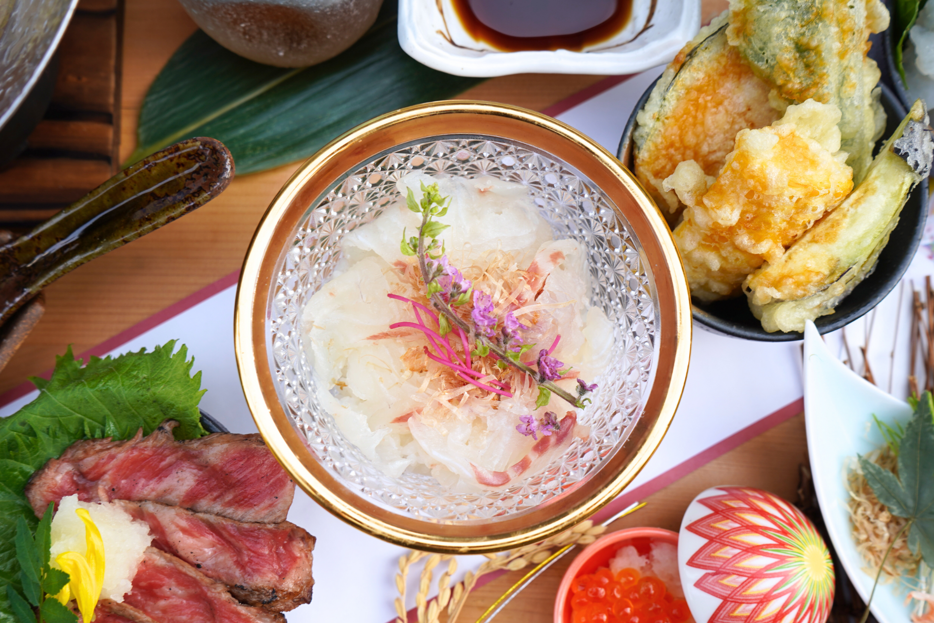 黄金色をしたお出汁が半透明な鯛にかかる様子はとてもキレイで、目でもお食事をお楽しみ頂けます。