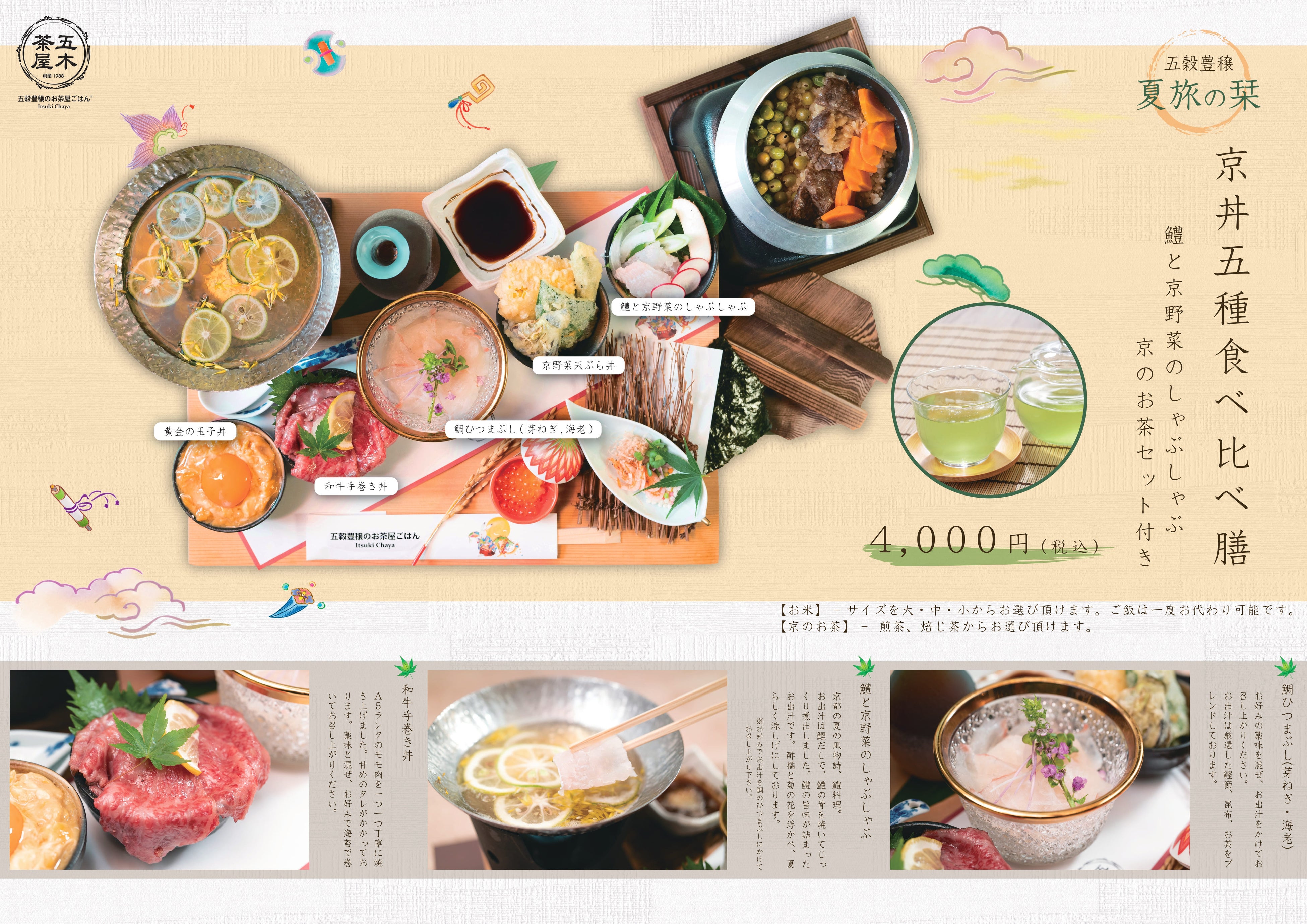 京都・嵐山で食べログアクセスランキング1位獲得の五穀豊穣のお茶屋ごはん®︎ 五木茶屋 伏見稲荷店で6月1日から夏の新メニュー 夏の京丼五種食べ比べ膳をスタート。京都の夏の風物詩である鱧、夏の京野菜などをふんだんに使用した、味から盛り付けまで夏の京都をぎゅっと詰め込んだお膳です。