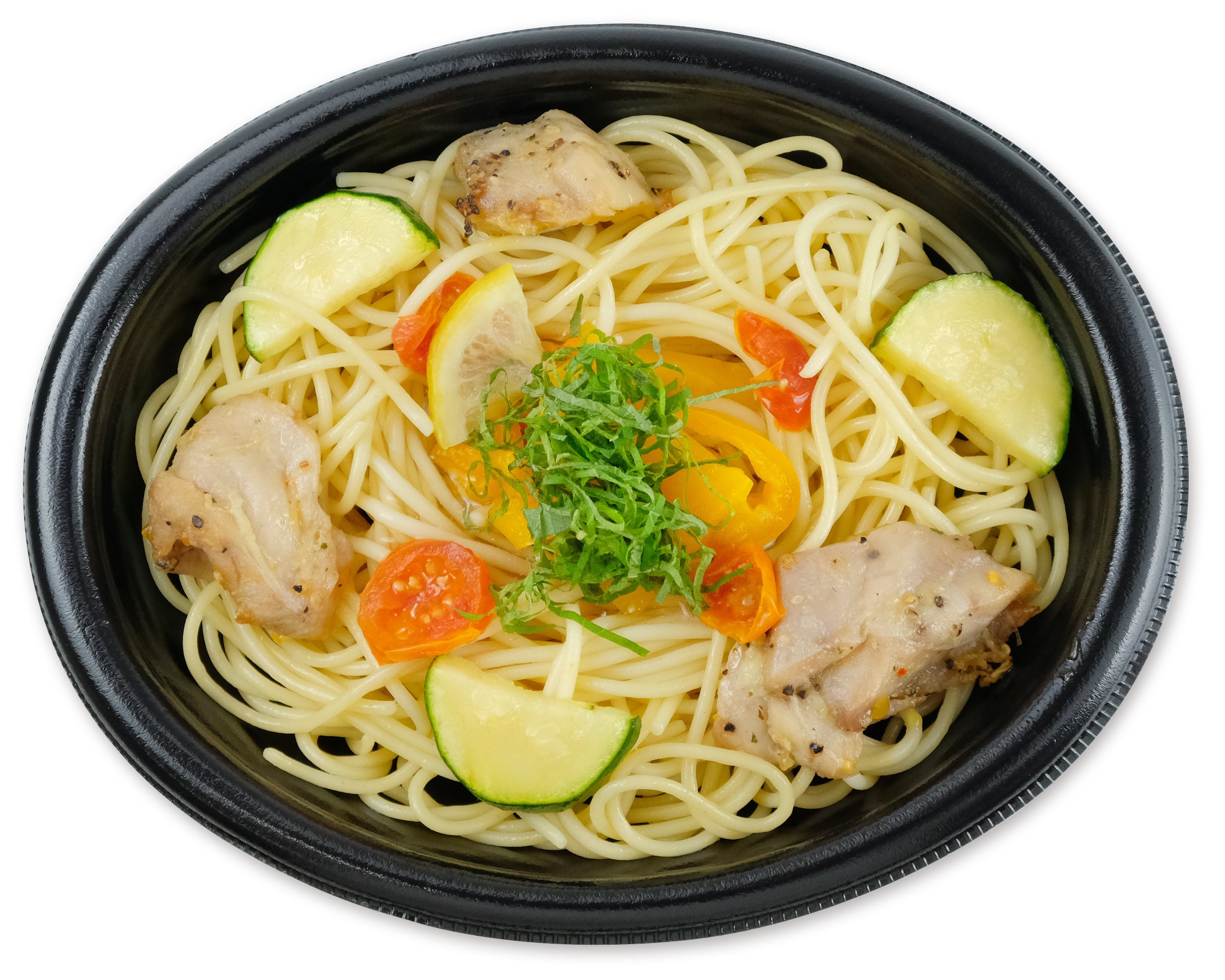 爽やかなレモンの酸味と大葉の風味でさっぱりと食べられる和風ベースのレモンオイルパスタ。 チキン・ズッキーニ・黄ピーマン・チェリートマトをトッピングしました。