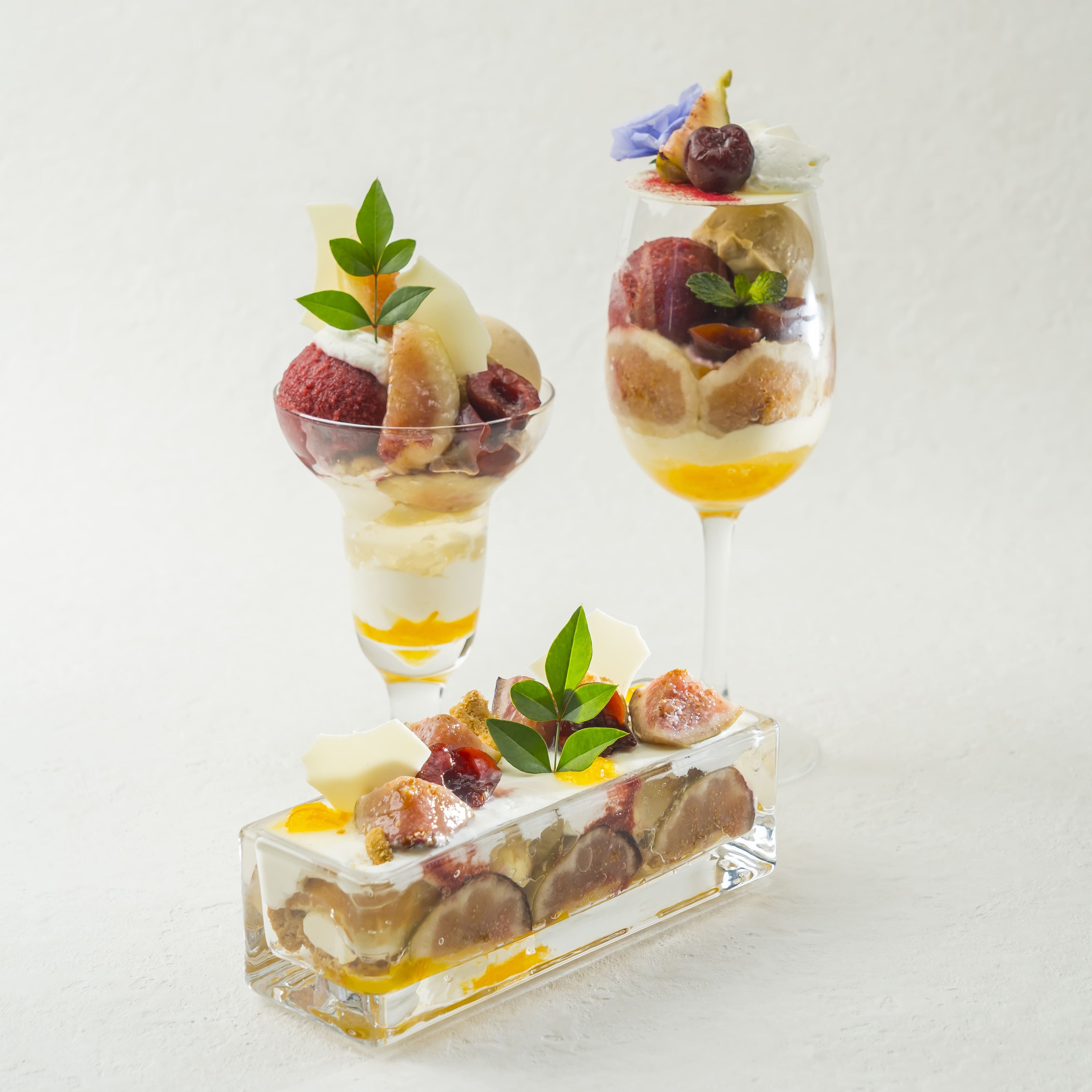 オレンジの味をそのまま閉じ込めたコンポート、滑らかなフロマージュブランクリーム、すだちのさっぱりジュレを層にしたパフェグラスの上には、いちじくとアメリカンチェリー、そして自家製の紅茶アイスとチェリーシャーベットをこんもりと盛り付けました。オレンジの香りを纏ったカスタードクリームやクランブルのサクサク食感がアクセントを添える、心躍るパフェです。