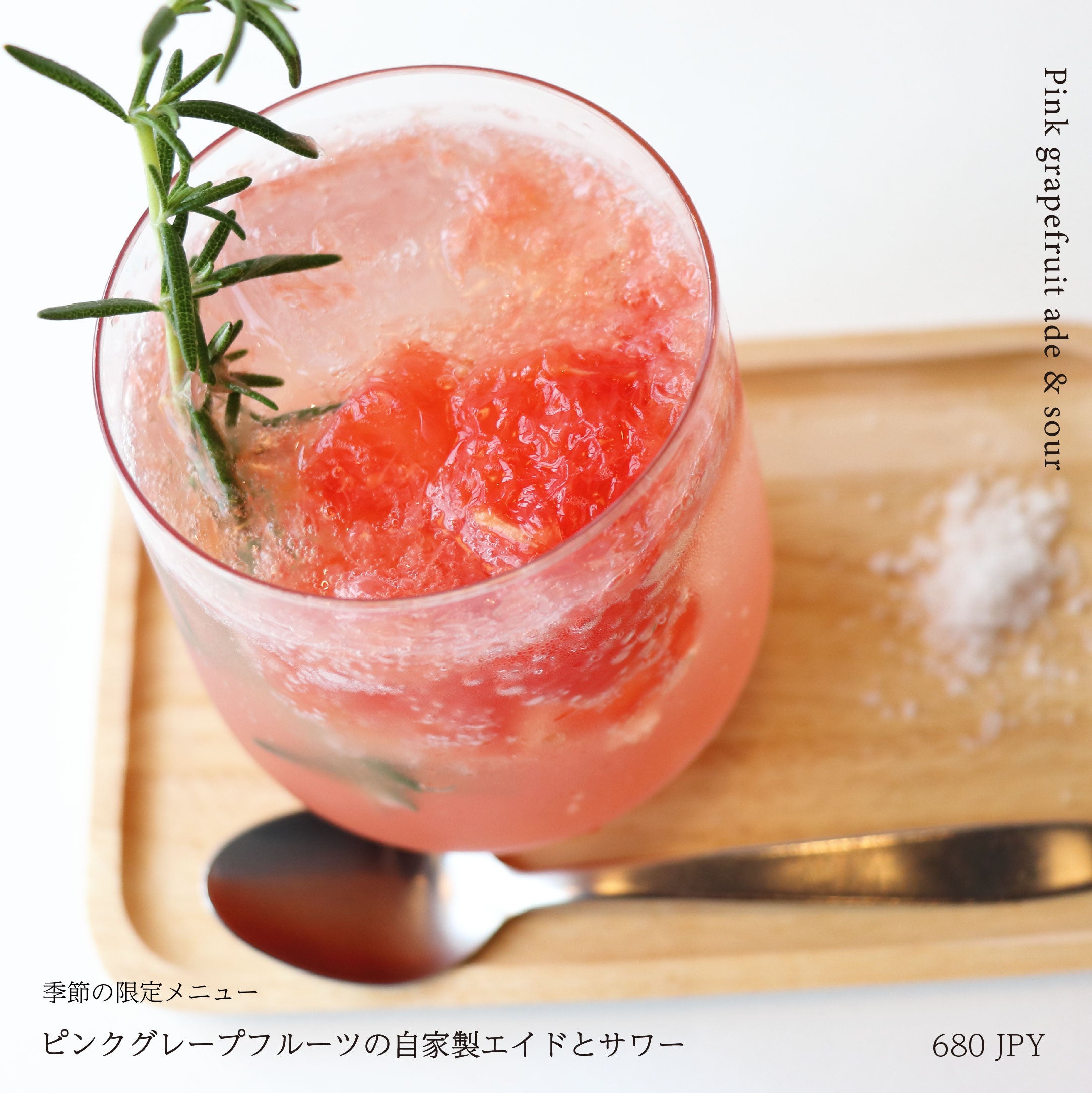 オリジナルドリンクは見た目も可愛らしいピンクグレープフルーツを炭酸で割って夏らしく。炭酸水はサワーにしアルコールでのご提供も可能です。