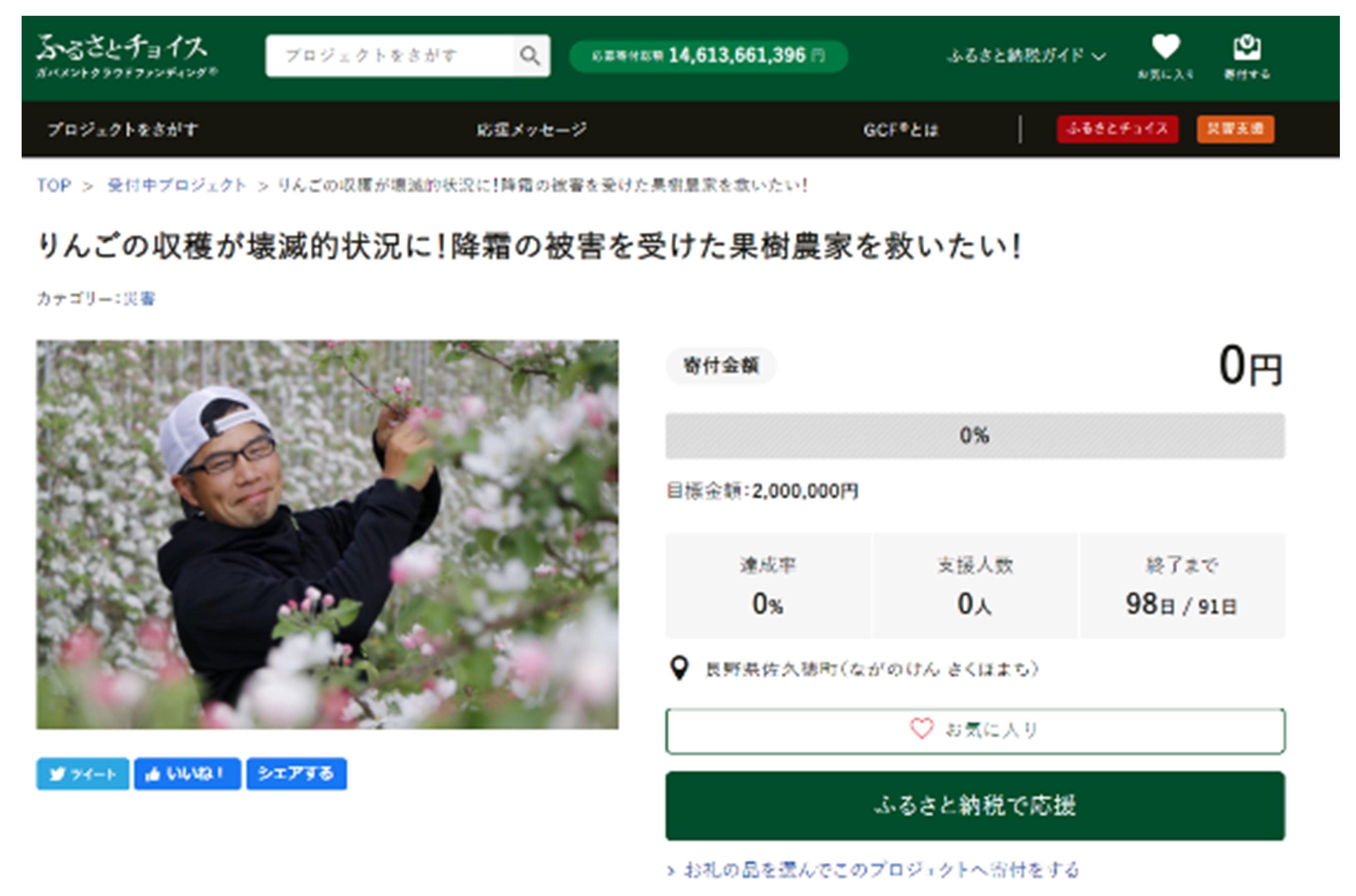 ◆ プロジェクト名: りんごの収穫が壊滅的状況に!降霜の被害を受けた果樹農家を救いたい!