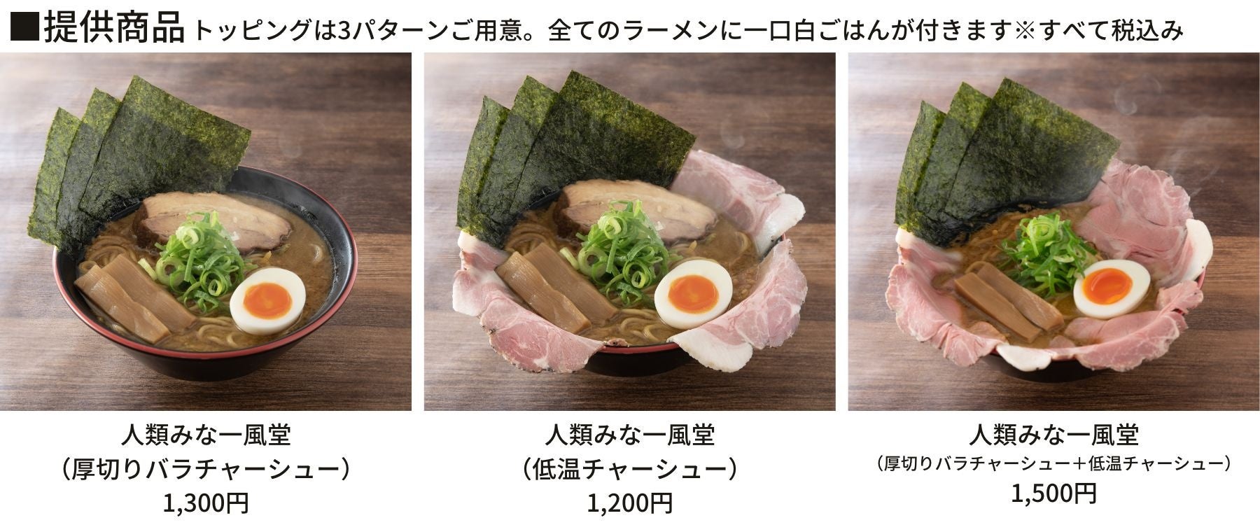 ラーメンの名称は、コラボレーション に相応しくふたつのブランド名から取り「人類みな一風堂」に。「一風堂」創業者の河原成美と「人類みな麺類」創業者の松村貴大で、何度も試作を重ね作り上げました。「一風堂」のなめらかな豚骨スープに「人類みな麺類」の醤油ベースのかえしや名物の厚切りチャーシュー、低温調理したピンク色の薄切りチャーシューが奇跡の融合。
