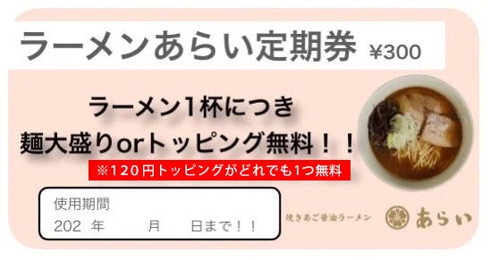 【焼きあご醤油ラーメンあらい】ではラーメン1杯につき麺大盛りorトッピング無料になるお得な定期券を販売しております!