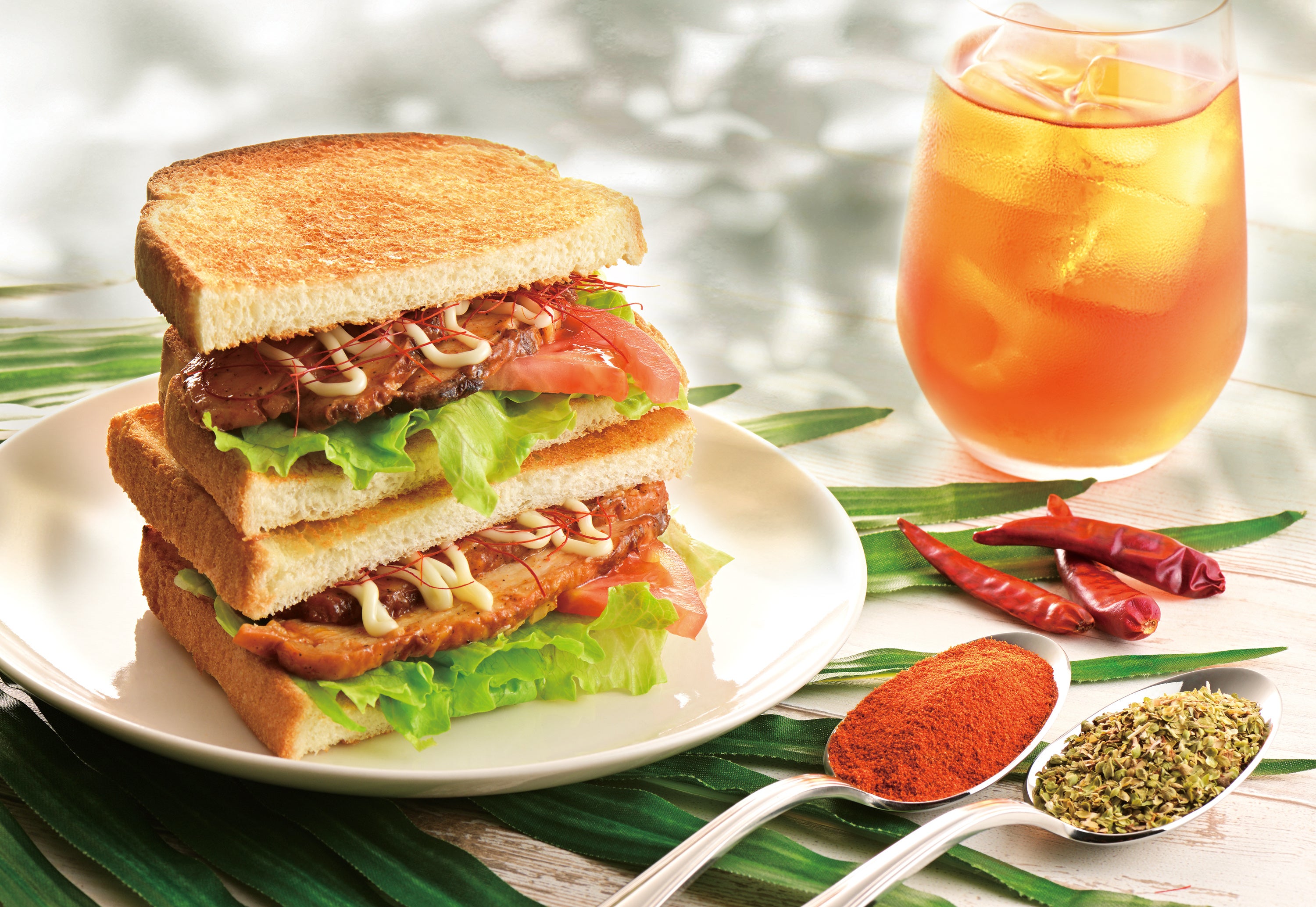 宮崎日南どりを6種類のスパイスで味付けしたスパイシーチキンと、シャキシャキのレタス、フレッシュなトマトをサンドした夏の味わいです。 |