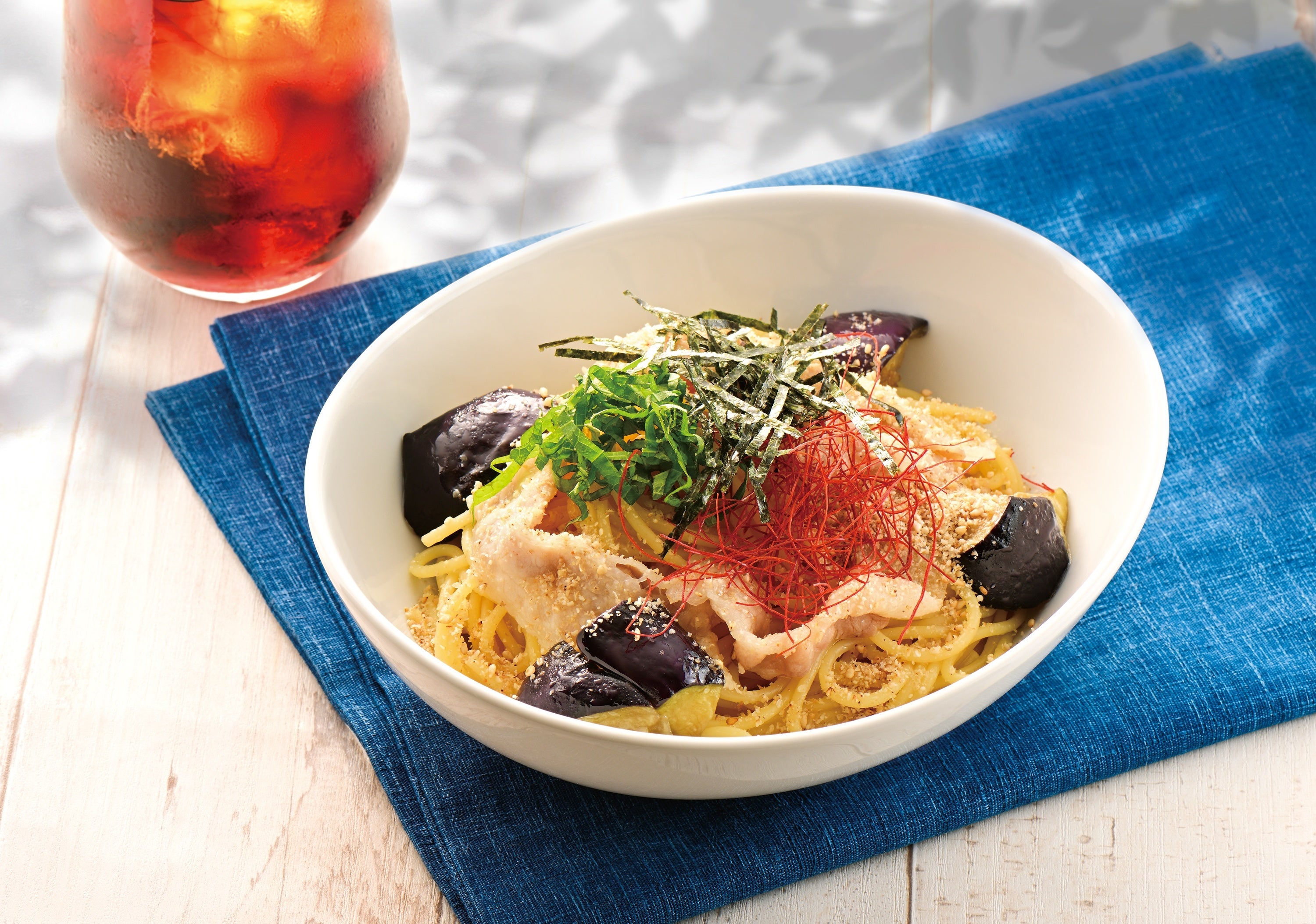 醤油ごまダレで味付けした豚しゃぶと揚げなすを組み合わせ、白すりごまをトッピングした風味豊かな和風パスタです。 |