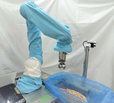 従来、人が対面で行っていた組合せはかりでの食材の計量をCOBOTTA PROと人で分業できるシステムをご提案します。COBOTTA PROに3次元カメラとソフトハンドを組み合わせて、軟体物の食材計量作業の省人化を実現します。