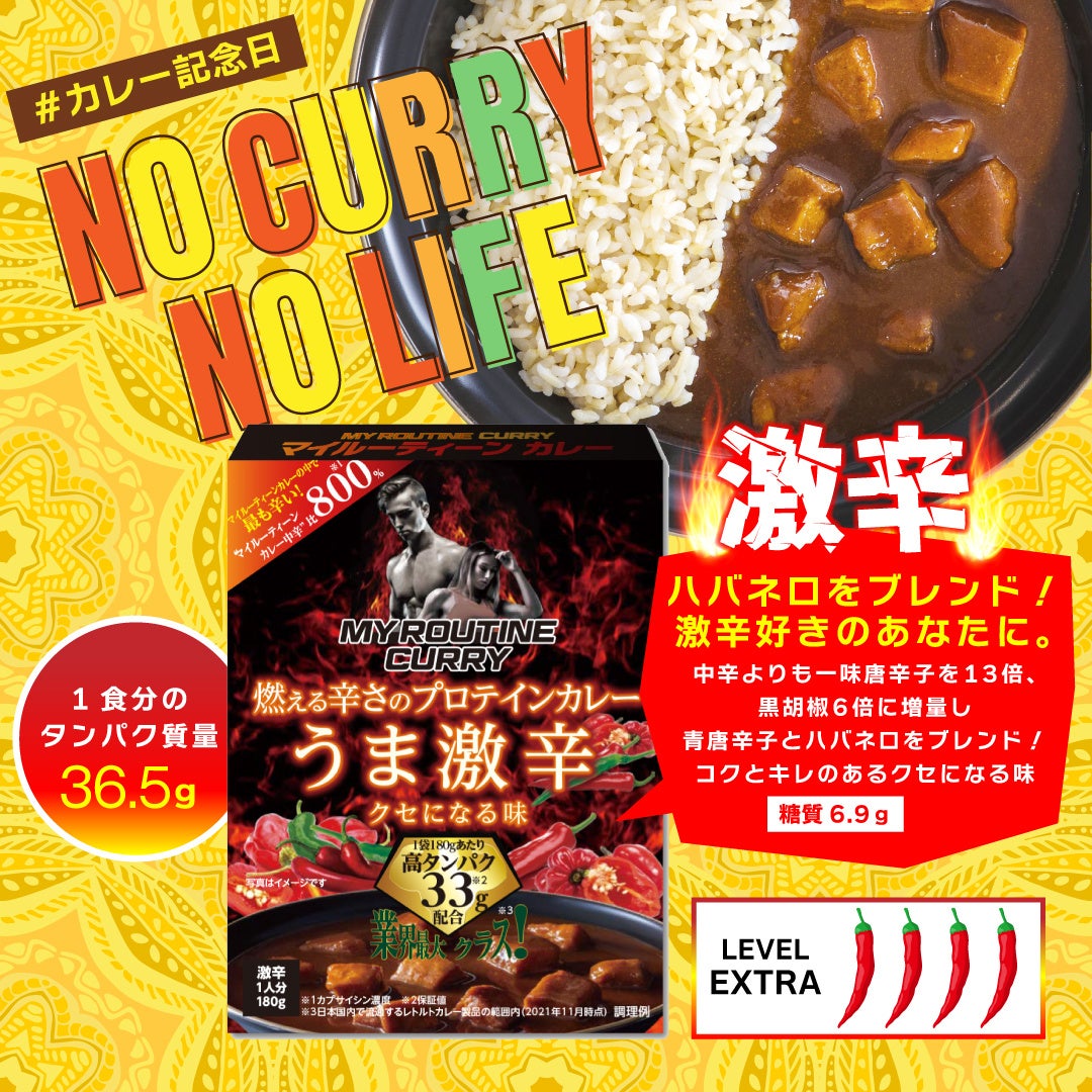 ダイエットや健康の為に、厳しい食事管理や制限をしている人たちの「気にせずに食べたい!」「もっと食べたい!」そんな思いと叫びを商品化したカレーです。マイルーティーンカレーは、タンパク質を1食分(180g)あたり37.2g*をしっかり補給出来る事に加え、減量期やダイエットする上で注目したい脂質量も驚きの6.8g*に抑え、美味しさと高スペックを兼ね備えたタンパク質高配合のプロテインカレーです。新発売したうま激辛は、青唐辛子とハバネロをブレンドし、中辛では満足できない激辛好きの方にもおすすめなコクとキレのあるチキンカレーです。(* 中辛/栄養成分表示)