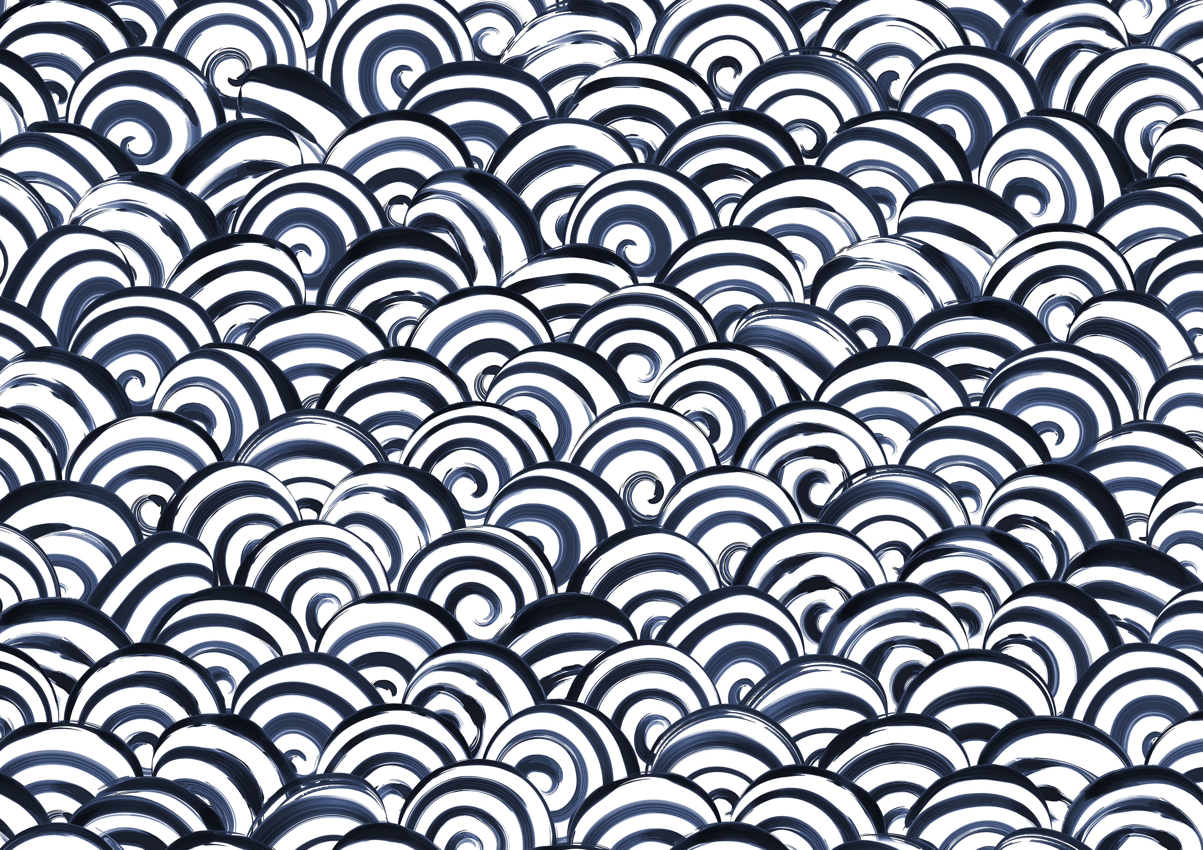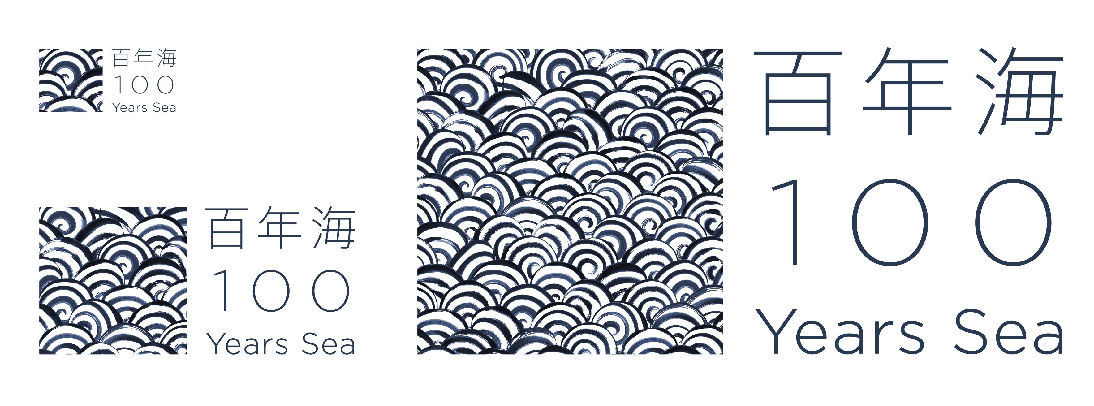 日本料理「百年海」ロゴは、作品《渦の海》を切り取っている。《渦の海》の渦の物理的サイズは固定されている。通常のロゴとは違い、ロゴが物理的に大きくなれば、切り取る範囲は大きくなり渦の数は増えていく。