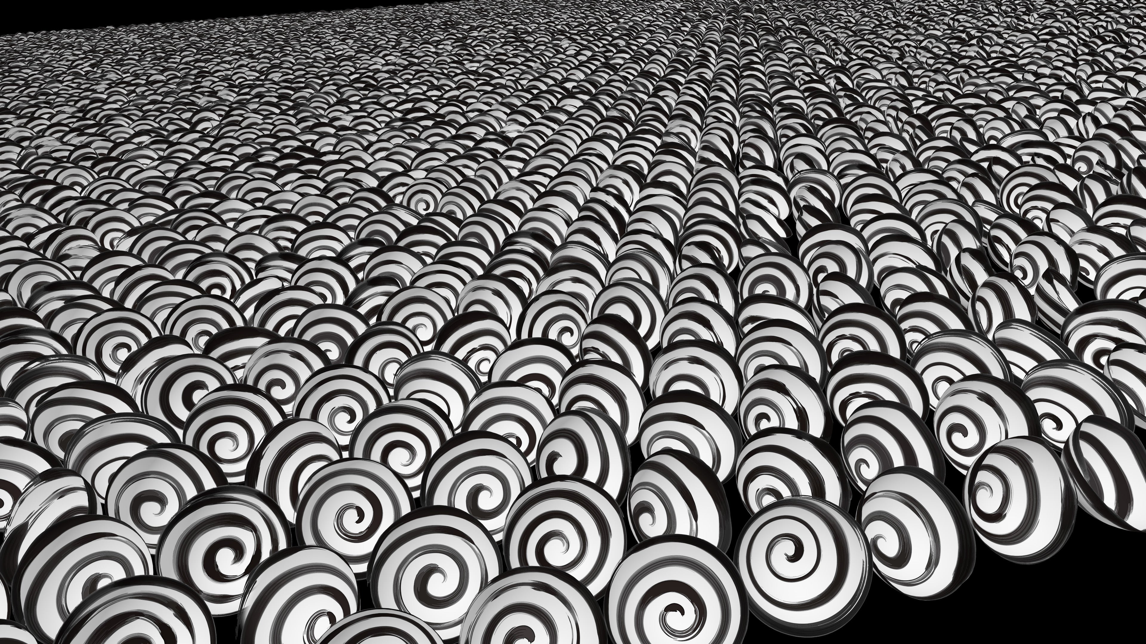 チームラボの作品《渦の海》は、渦を立体的に描き、その渦が無限に続く空間を、チームラボの「超主観空間」によって切り取って描かれた。