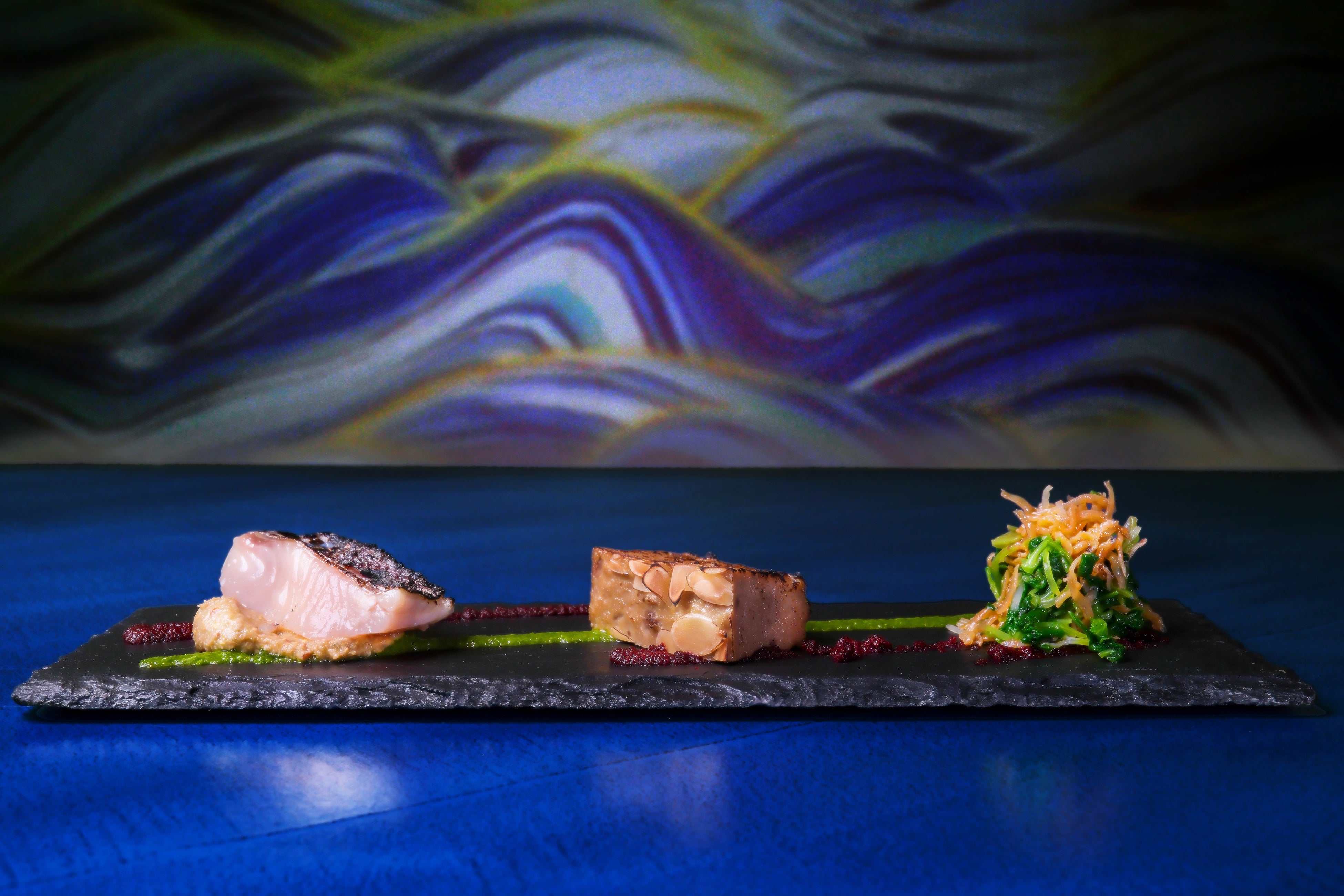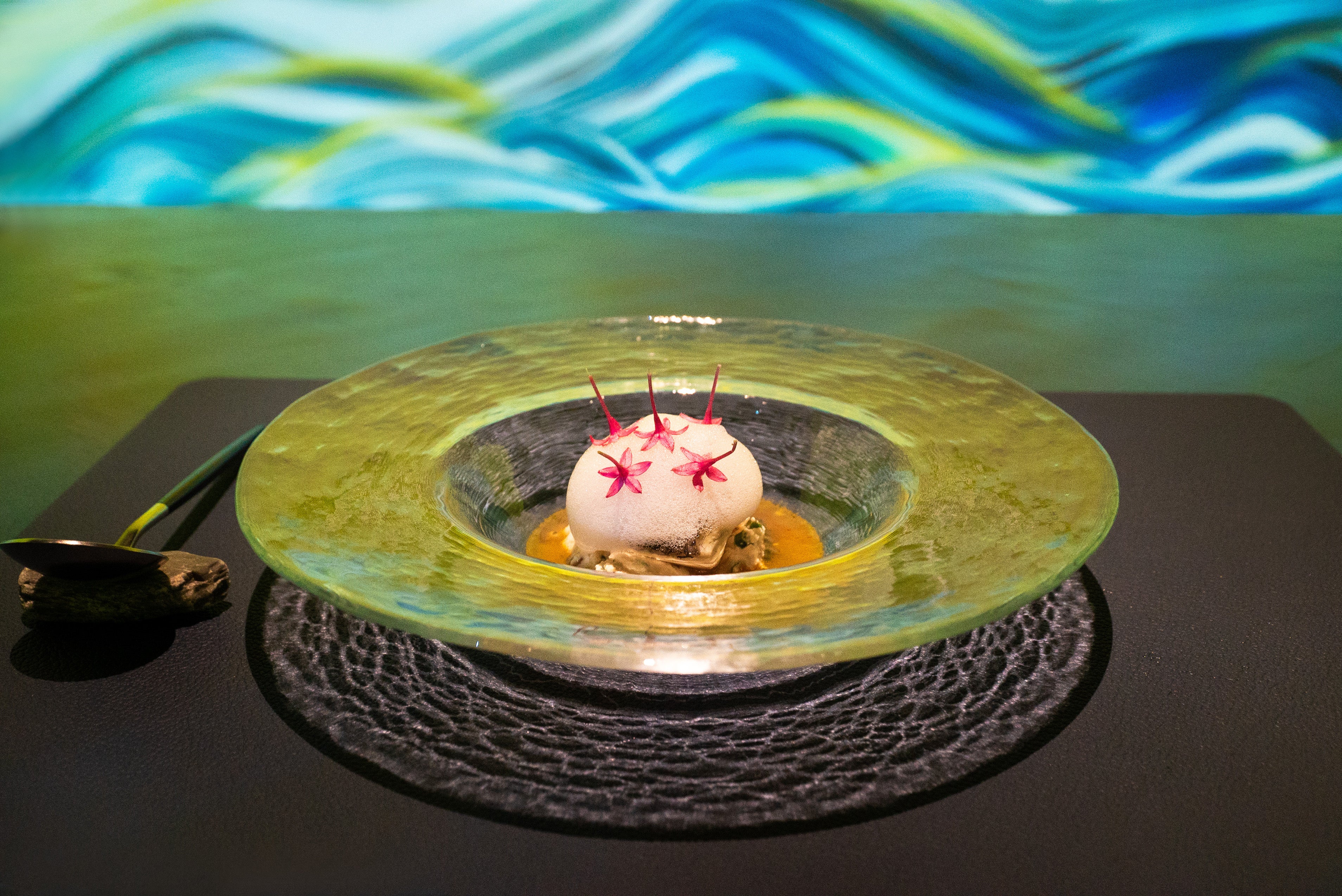 魚介は、未利用の鳴門の天然魚を100%、肉は、猪肉や鹿肉など害獣駆除対象の徳島南部のジビエを100%使った日本料理を、100年後まで海面が上昇し続ける海を描き続ける《百年海図巻[上映時間:100年] 》の作品の中で食事をします。100年後も美しい海を想い、模索し、実践する場所にしたいと考えています。