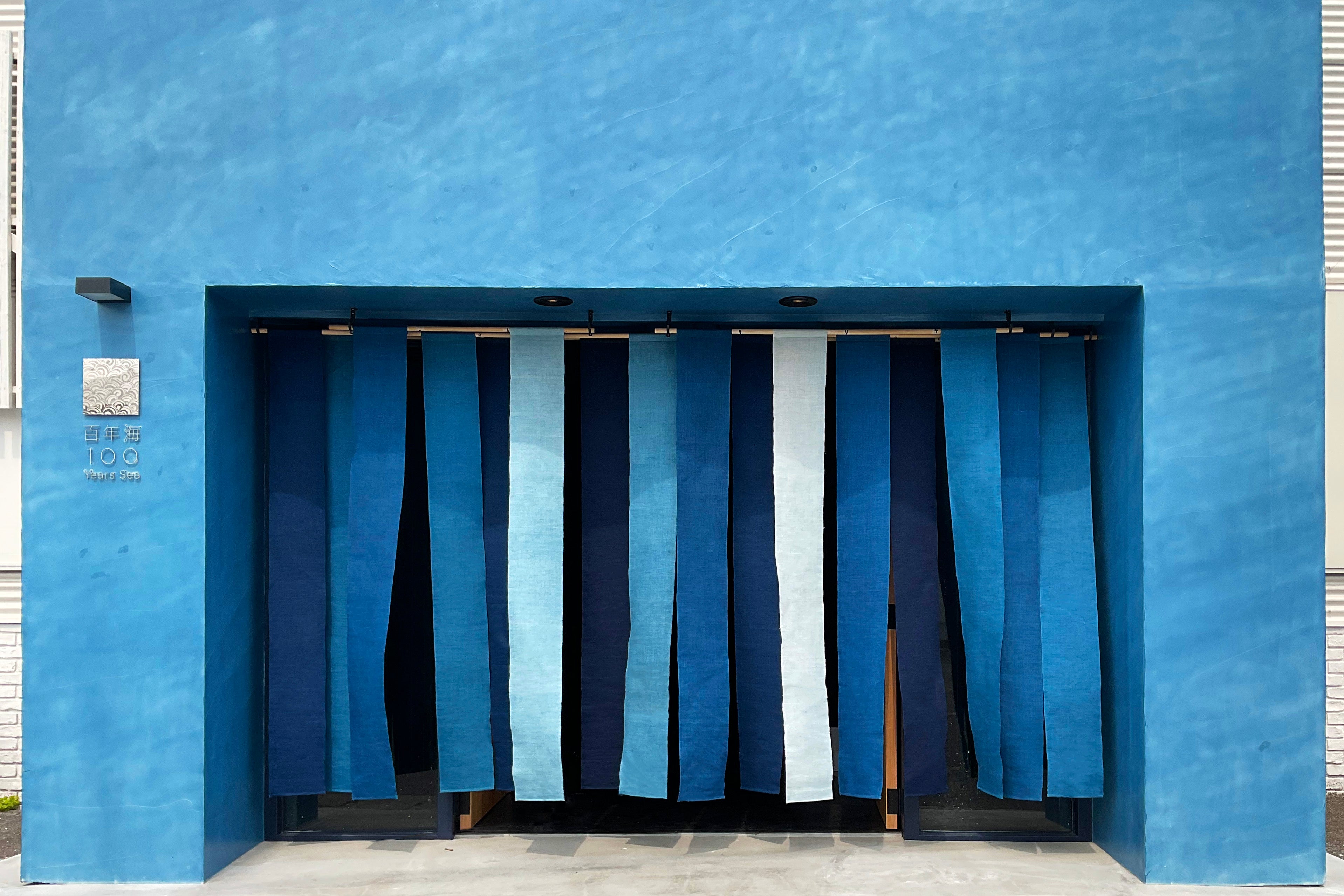 暖簾は、徳島県で藍の栽培から製作までを行っているBUAISOUの製作、色は7色[白藍(shiraai)/甕覗き(kamenozoki)/浅縹(asahanada)/浅葱(asagi)/縹(hanada)/藍(ai)/濃藍(koiai)]。