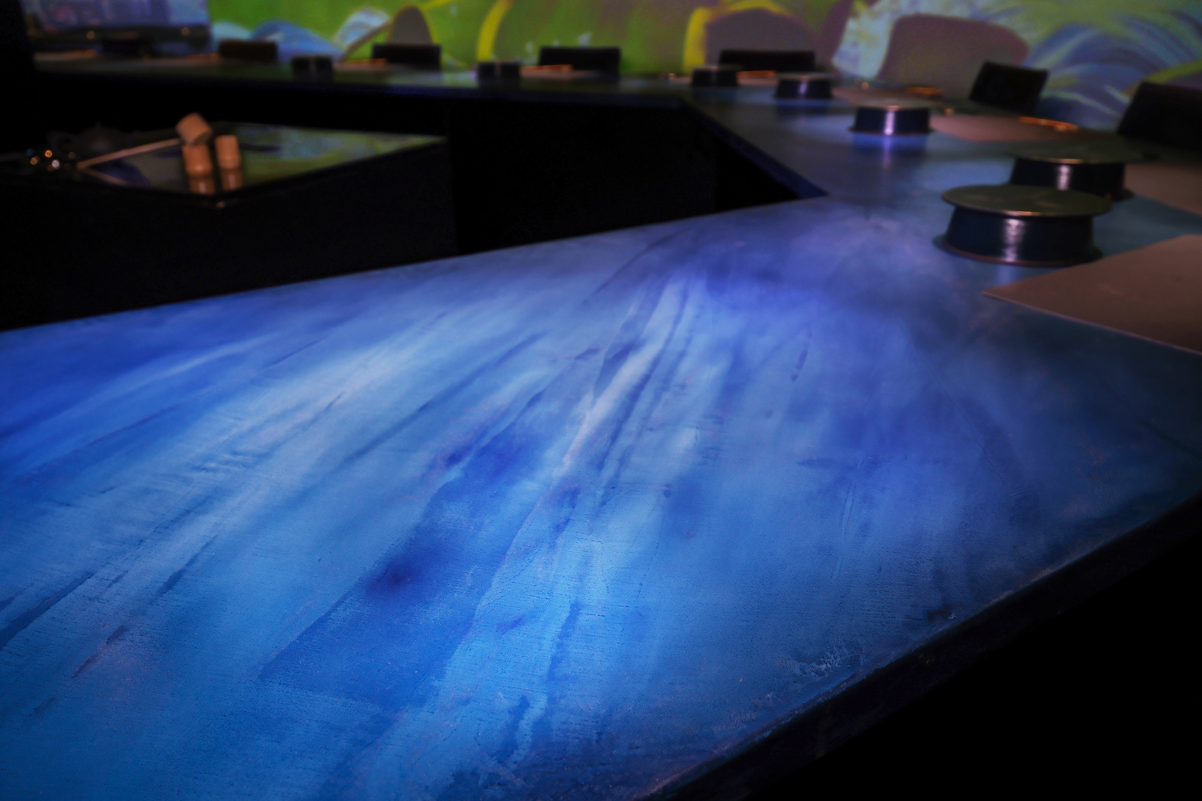 テーブルは、天然藍による藍コンクリートを使用。藍コンクリートを開発したリテラスの喜田智彦氏が、《百年海図巻》が上映されている状態で左官し、作品と一体となる藍のグラデーションを作り上げた。