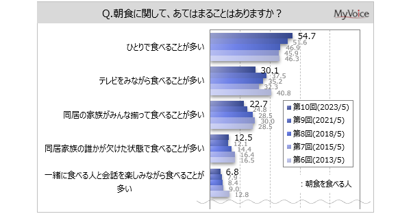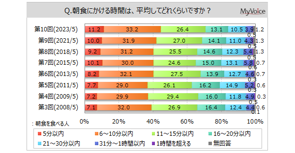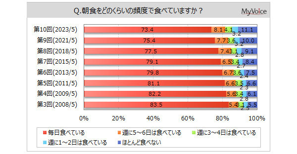 <今 回>(2023/5)https://myel.myvoice.jp/products/detail.php?product_id=29804 ※上記設問の他に、「朝食を食べない理由」なども聞いています。 <第9回>(2021/5)https://myel.myvoice.jp/products/detail.php?product_id=27402 <第8回>(2018/5)https://myel.myvoice.jp/products/detail.php?product_id=23803 |