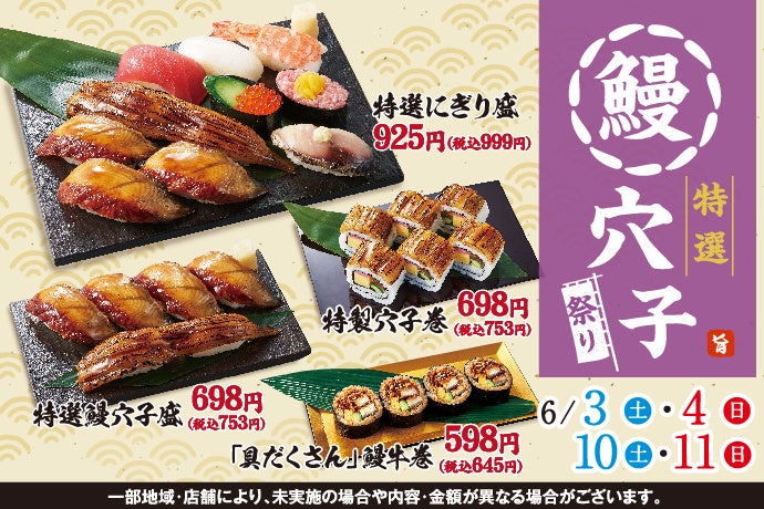 ジューシーな鰻と炙った1本穴子をメインに、厳選した人気ネタを盛り合わせました。フェアのおすすめ商品です♪