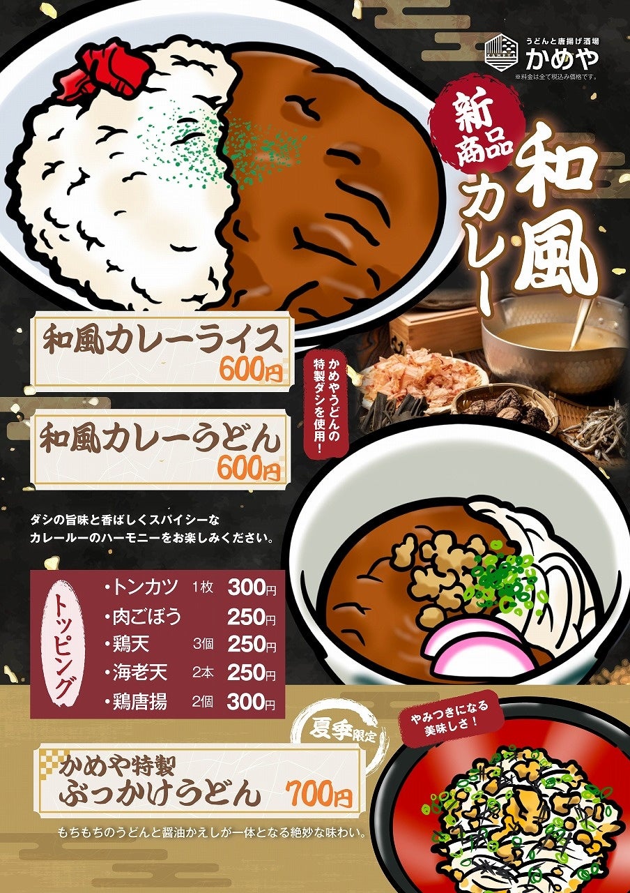 「うどんと唐揚げ酒場かめや」では、この新しい感覚の和風カレーをお酒とともに楽しむことができ、幅広い客層に対応した多様な食文化を発信しています。