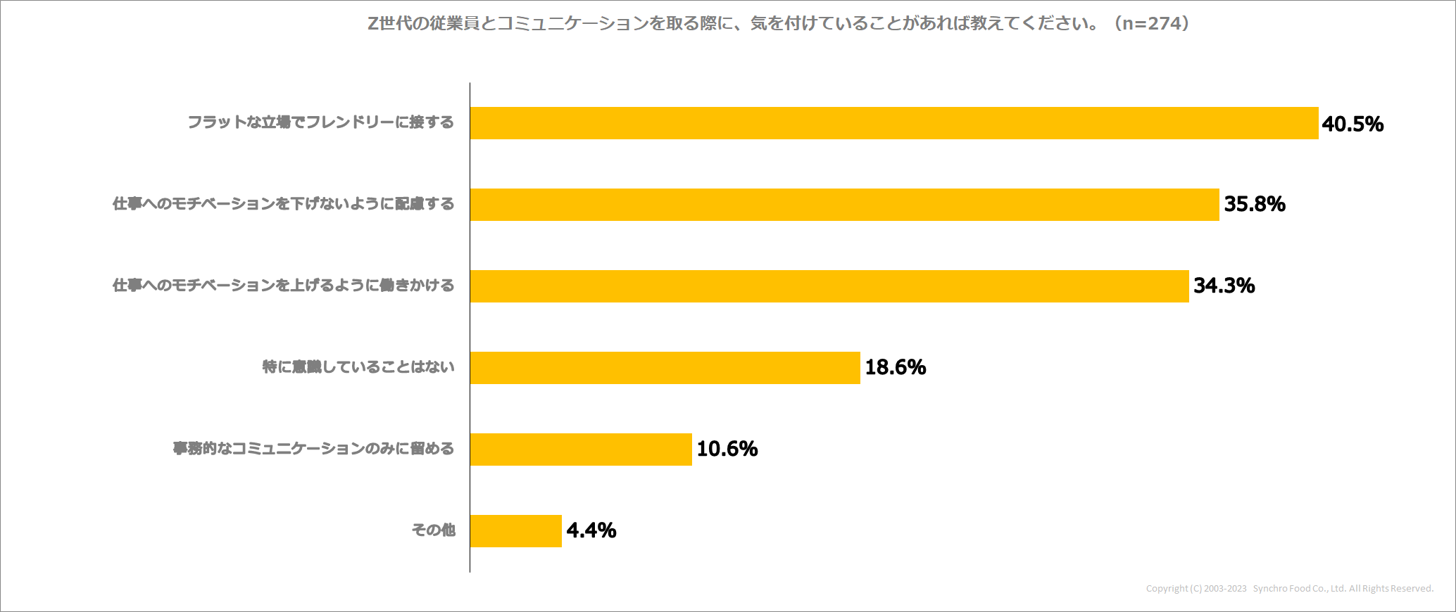 また、「Z世代の従業員の在籍歴がある」と回答した方に、Z世代の従業員とコミュニケーションを取る際に気を付けていることを質問したところ、「フラットな立場でフレンドリーに接する」との回答が、40.5%で最多となりました。次いで、「仕事へのモチベーションを下げないように配慮する(35.8%)」、「仕事へのモチベーションを上げるように働きかける(34.3%)」との回答が続きました。
