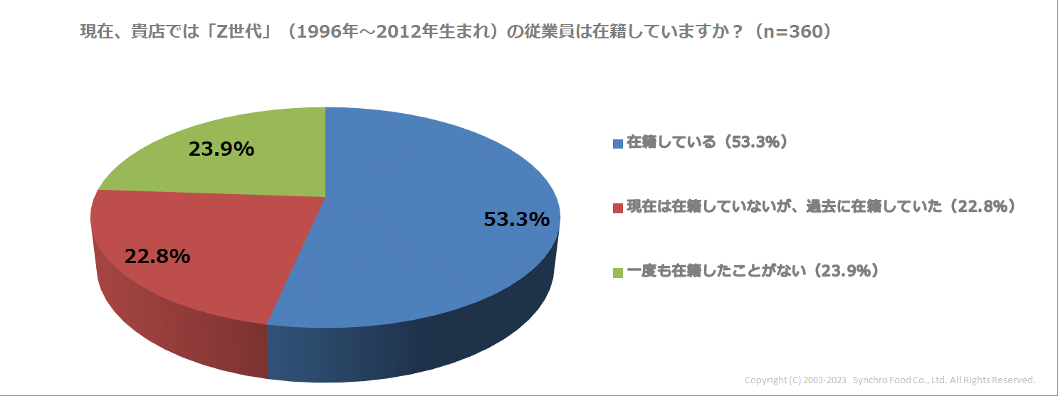 はじめに、Z世代の従業員の在籍状況を尋ねたところ、「在籍している」が53.3%、「現在は在籍していないが、過去に在籍していた」が22.8%となり、76.1%の店舗でZ世代が働いていたことが明らかとなりました。