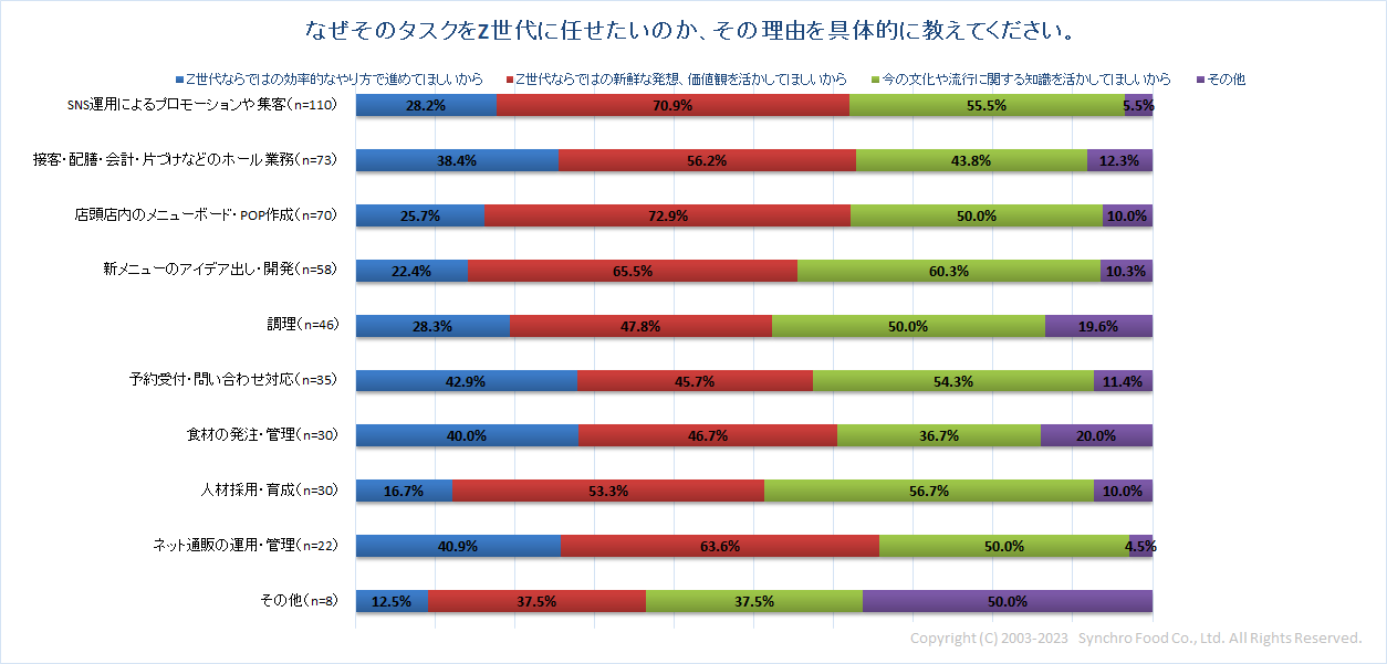 さらに、なぜそのタスクをZ世代に任せたいのか理由を尋ねたところ、ほとんどのタスクにおいて「Z世代ならではの新鮮な発想、価値観を活かしてほしいから」との回答を選択する傾向が目立ちました。こうしたなか、「調理」、「予約受付・問い合わせ対応」、「人材採用・育成」については「今の文化や流行に関する知識を生かしてほしいから」との理由を選ぶ傾向が比較的高く見られました。これは、トレンドをメニューに取り入れたいとの考えや、SNSを活用した予約導線、人材募集のしくみに注目する飲食店が増えてきているためとも推察されます。