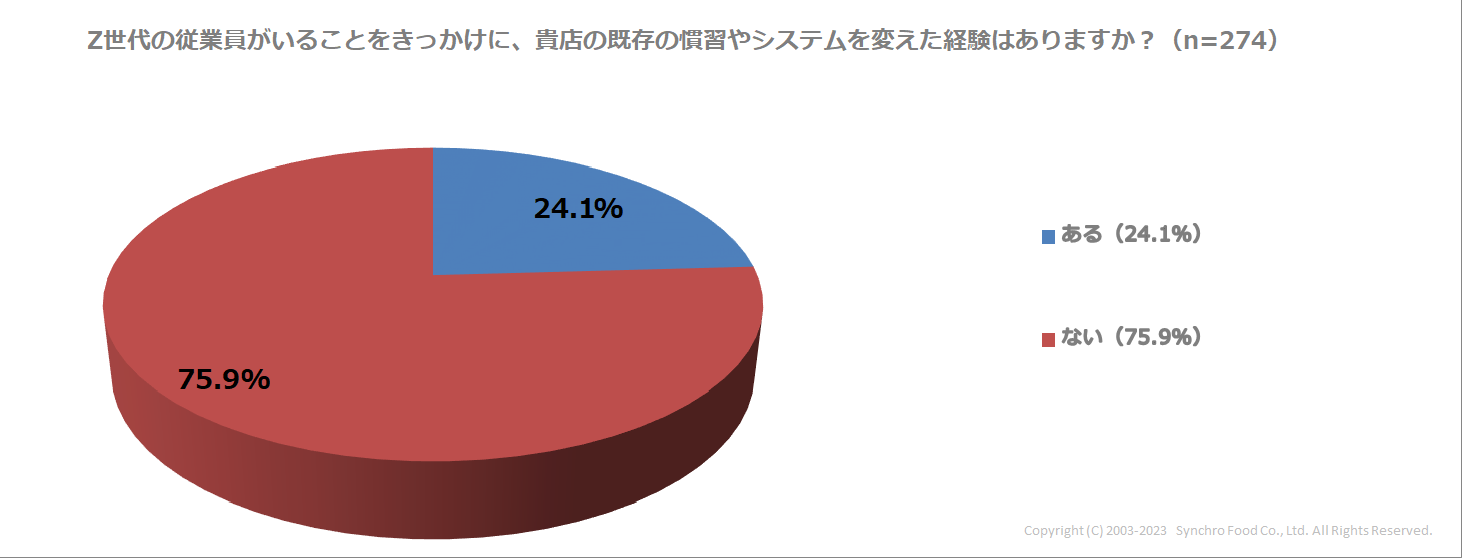 また、「Z世代の従業員の在籍歴がある」と回答した方に、Z世代の従業員がいることをきっかけに、自店舗の既存の慣習やシステムを変えた経験があるか質問したところ、7割以上が「ない(75.9%)」と回答。「ある」と回答したのは、24.1%の店舗にとどまりました。