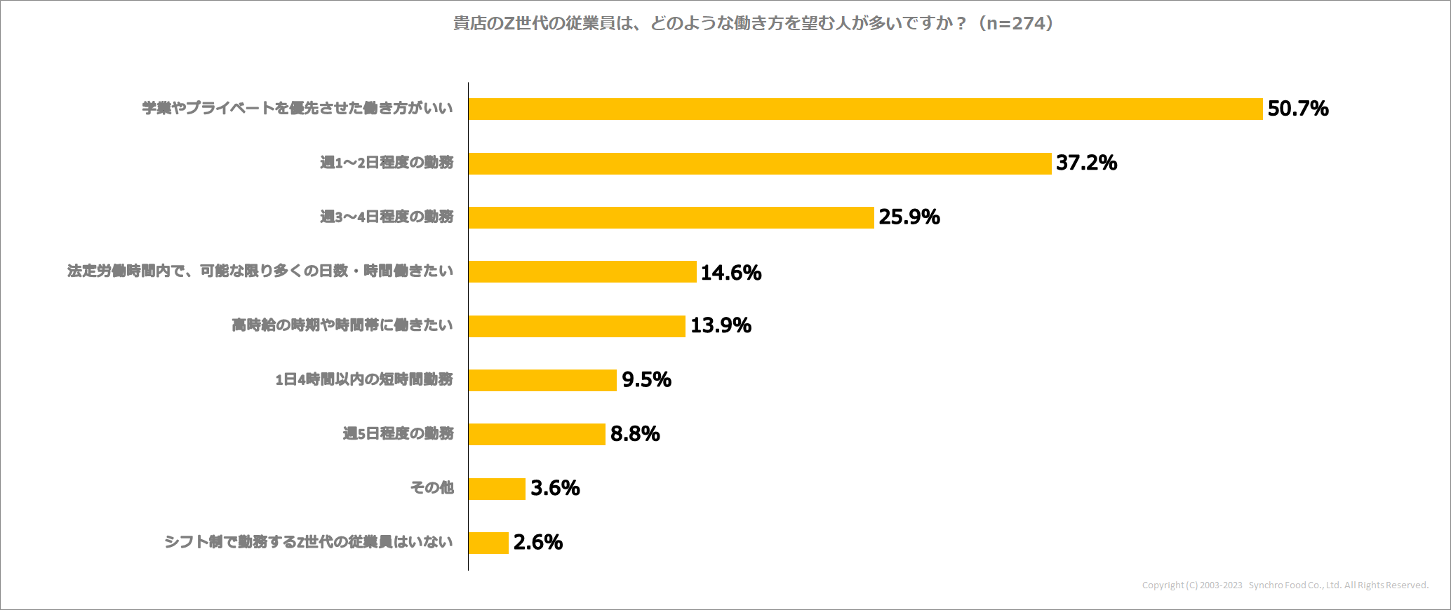 続いて、「Z世代の従業員の在籍歴がある」(「在籍している」、「現在は在籍していないが、過去に在籍していた」)と回答した方に、シフト制の勤務形態をとるZ世代の従業員において、どのような働き方を望んでいる人が多いか答えてもらいました。すると、最も多かったのが「学業やプライベートを優先させた働き方がいい」との回答で50.7%。続く回答も「週1~2日程度の勤務(37.2%)」、「週3~4日程度の勤務(25.9%)」と、勤務日数が少ない働き方を希望する従業員が多いことがわかりました。