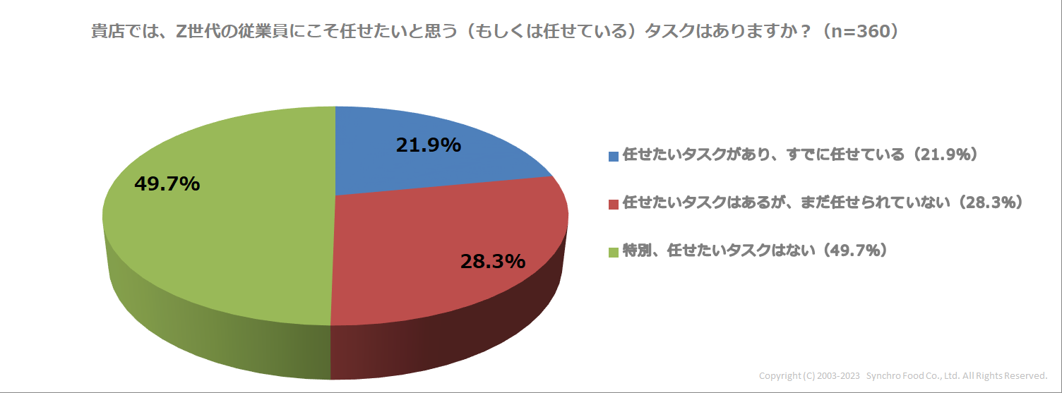 続いて、Z世代の従業員にこそ任せたいと思う(もしくは任せている)タスクについて尋ねたところ、最多は「特別、任せたいタスクはない」との回答で49.7%でした。一方で、Z世代の活躍に期待を寄せている店舗も多く、「任せたいタスクがあり、すでに任せている」は21.9%、「任せたいタスクがあるが、まだ任せられていない」は28.3%と、約半数が「任せたいタスクがある」と回答しています。