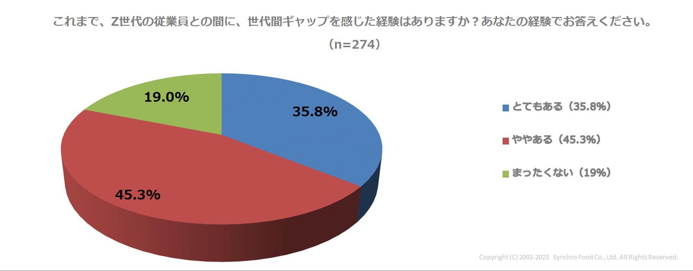 次に、「Z世代の従業員の在籍歴がある」と回答した方に、Z世代の従業員との間に、世代間ギャップを感じた経験があるか尋ねたところ、81.1%もの人が「ある」(とてもある=35.8%、ややある=45.3%)と回答。Z世代の従業員が在籍していた店舗の多くが、世代間ギャップを少なからず感じていることがわかりました。