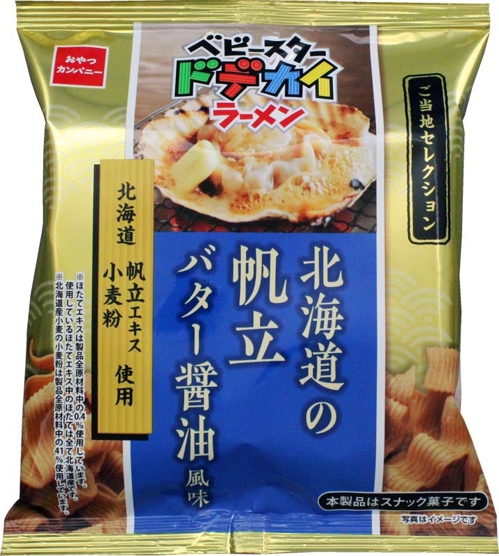 「ベビースタードデカイラーメン(北海道の帆立バター醤油風味)」は、北海道産の小麦粉と北海道産帆立のエキスを使用。帆立の旨みとバターのコク、醤油の香ばしさが広がる、豊かな風味に仕上げました。