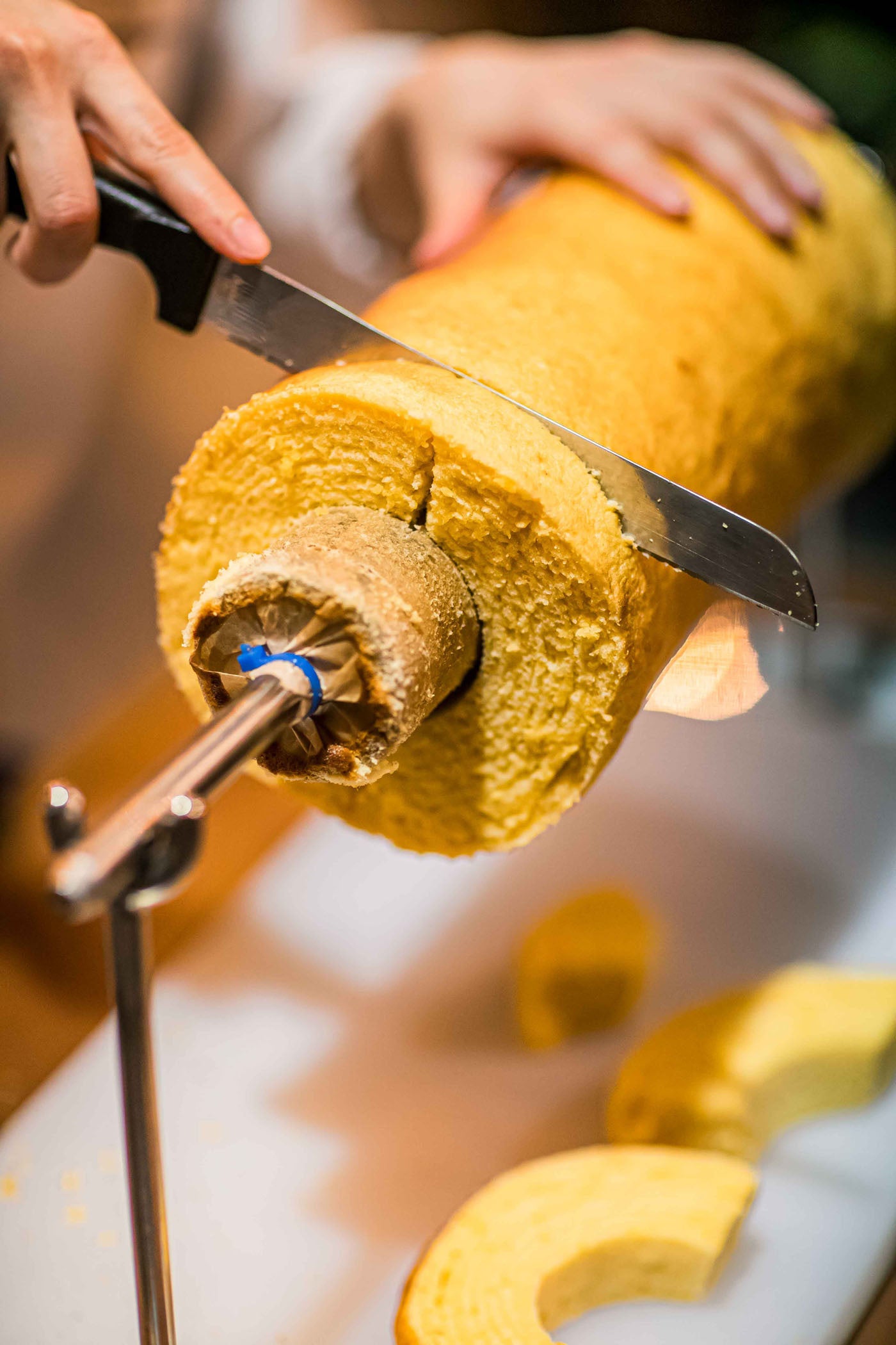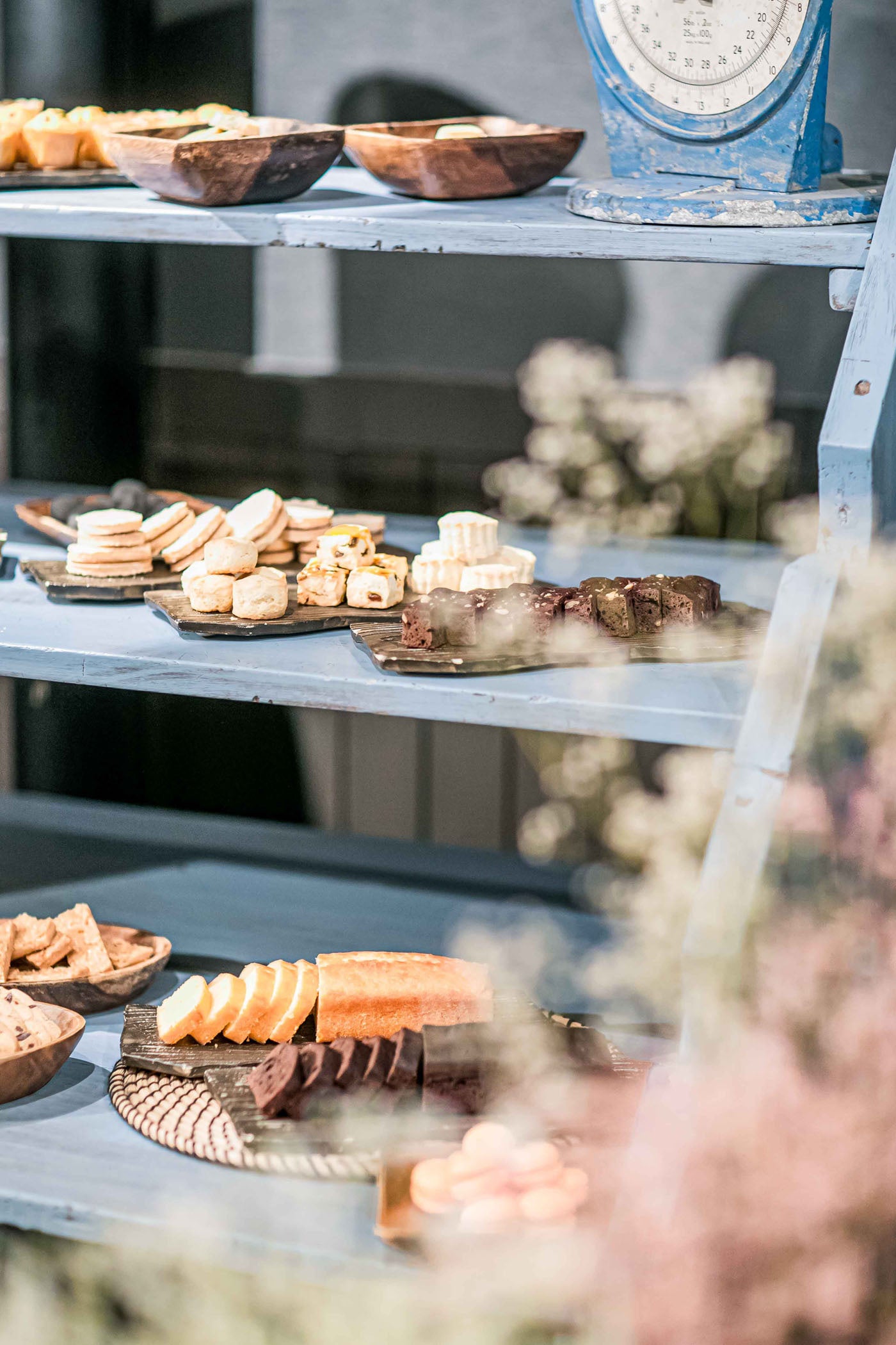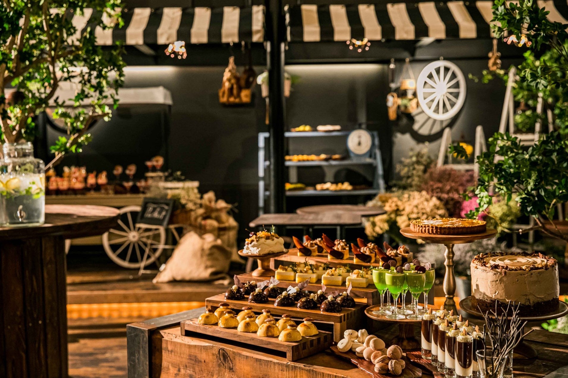 結婚式でも大好評のデザートブッフェ専用会場「マルシェスタイルのデザートルーム」で楽しむデザートは焼き立てのバウムクーヘンをはじめ、色とりどり!マルシェ=市場のようにさまざまなデザートが並びます。