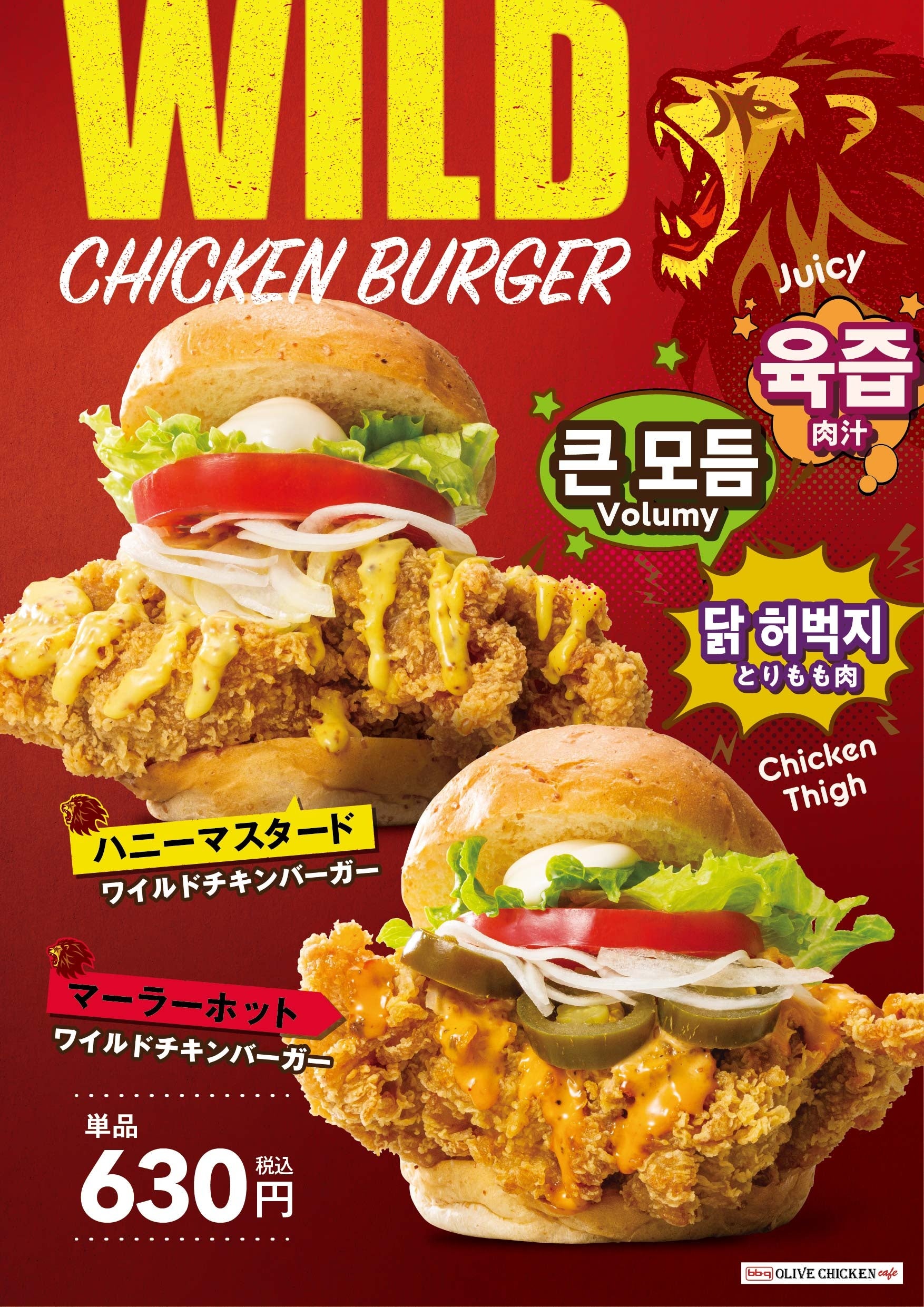 『ワイルドチキンバーガー』は食べ応えのある鶏モモ肉を、『オリーブチキンカフェ』の独自製法をそのままに仕上げた重量級オリジナルフライドチキンに仕立て、フレッシュ野菜とともに全粒粉バンズに挟み込みました。ソースはガッツリチキンの味に負けない『ハニーマスタード』と『マーラーホットマヨ』の2種類をご用意。従来の『オリーブチキンカフェ』とは一味違った、新体験の味をお届けします。