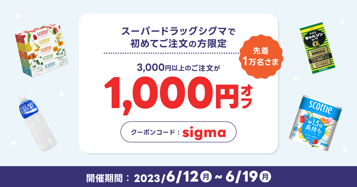 期間中、『出前館』から「スーパードラッグシグマ」の商品を初めてご注文される先着1万名さま限定!クーポンコード入力で3,000円以上のご注文が1,000円オフとなります。