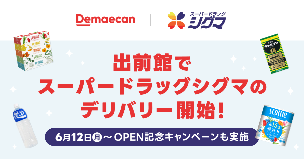 『出前館』では、「地域の人々の幸せをつなぐライフインフラ」をビジョンとして掲げ、それぞれの地域のニーズに合わせ、サービスを展開しております。このたびスーパードラッグシグマ深江南店でデリバリーを開始いたします。また、新規出店を記念して、「スーパードラッグシグマ」の商品を3,000円以上注文すると、1,000円オフになるキャンペーンを2023年6月12日(月)より実施いたします。なお、関西エリアでのドラッグストアの出店は今回が初めてとなります。