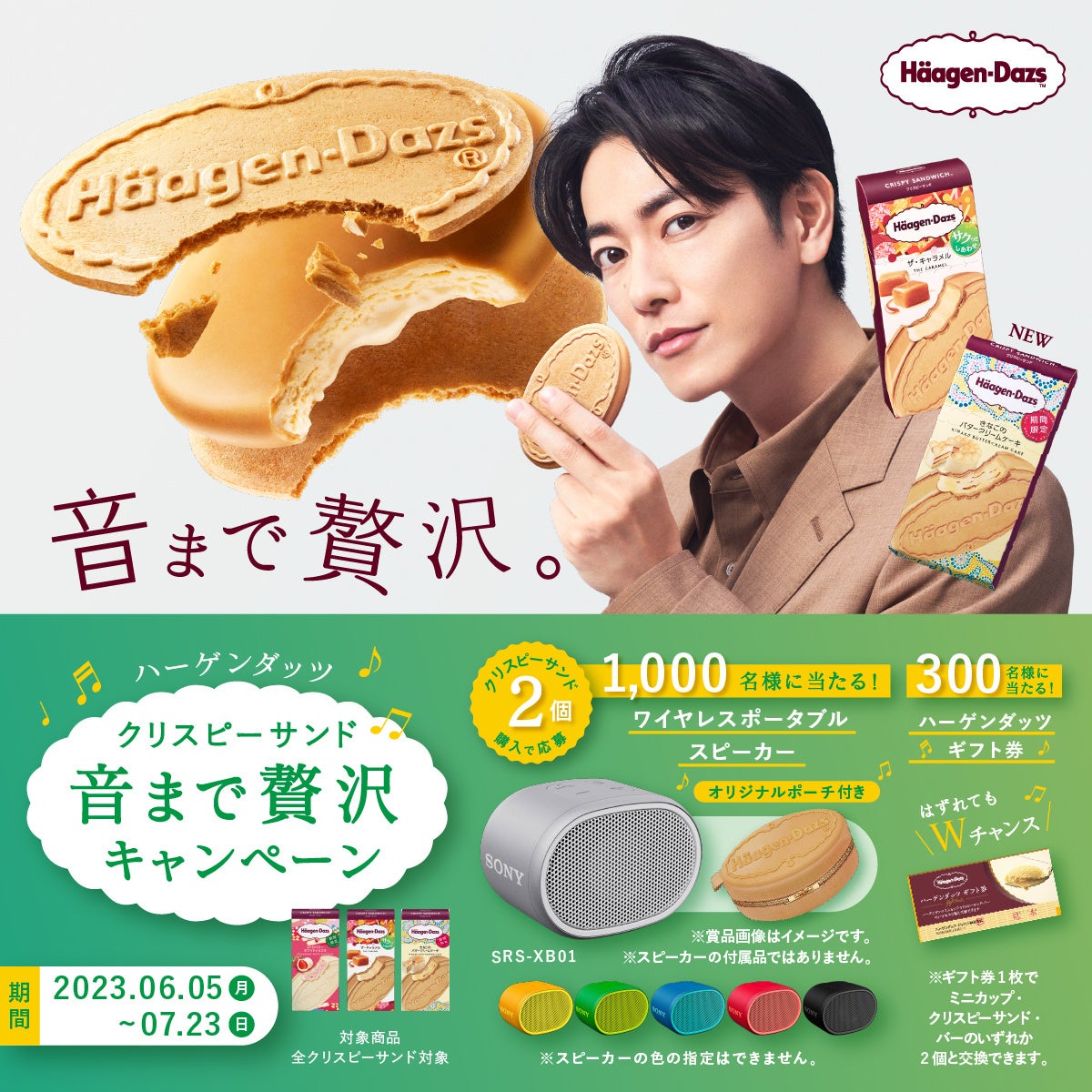 ハーゲンダッツオリジナルポーチ付きのワイヤレスポータブルスピーカーを抽選でプレゼントする「ハーゲンダッツ クリスピーサンド 音まで贅沢 キャンペーン」を実施します。