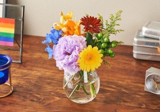 LGBTQ+の尊厳を表した6色のレインボーフラッグを、フラワーアソートにしてお届けします。赤・黄色のガーベラ、紫色のトルコキキョウ、青色のデルフィニウム、緑色のヒペリカムが、お部屋を華やかに彩ります。24センチと扱いやすい長さなので、小ぶりの花器に入れて食卓に飾るのもお薦めです。
