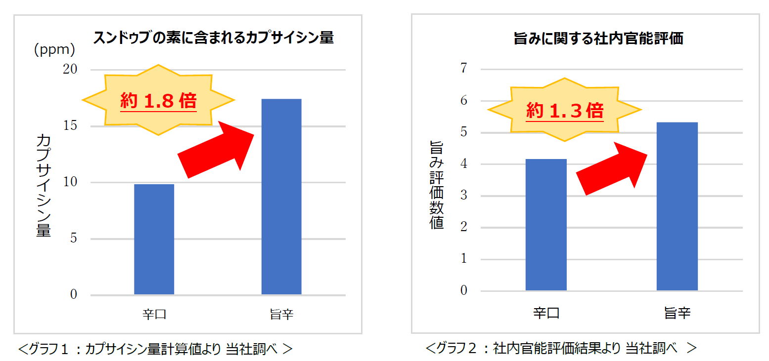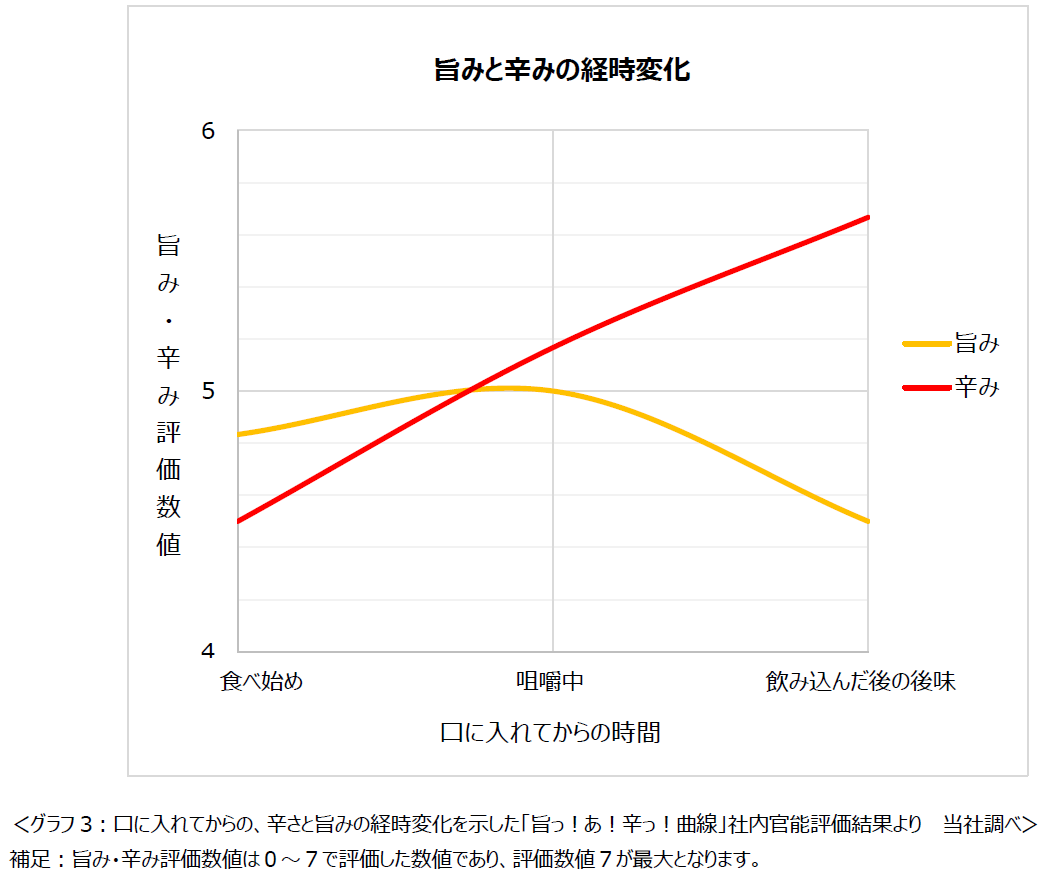近年、韓国ドラマやアイドルブームによって国内での韓国文化に対する興味や関心が高まり、食に関しても激辛ブームが定期的に巻き起こっています。そのような状況の中、直近では辛さに加えて、旨みやにんにく、スパイスなどの風味が際立つ食べ物が話題となっています。当商品は、「より辛い物が好きな方のため」ではなく、スンドゥブの素市場No.1シェア率※1を持つ当社だからこそ提供できる味。「辛い中にも旨みを感じ、最後までおいしく食べていただける」商品を目指し、開発しました。ただ辛いだけでなくひとくちの中で旨みと辛みを融合させるため、口に入れた瞬間は旨みを強く感じ、時間が経つにつれ後から青唐辛子のさわやかで刺激的な辛みが際立つような味わいを組み立てました。旨みと辛みをよりアップさせたことにより、ひとくちの中で旨みと辛みの変化が最後まで楽しめる味わいとなっています。ぜひ商品を食べて「旨っ!あ!辛っ!」となる丸大スンドゥブの旨辛体験をお楽しみください(グラフ参照)。