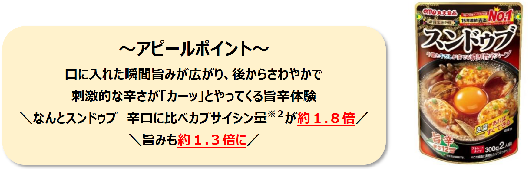 「豆腐があればすぐできる」をキャッチフレーズにご家庭でお手軽に韓国料理が食べられる当社スンドゥブシリーズはおかげさまで販売累計数2億個を突破し、スンドゥブの素15年連続売上No.1※1を獲得するなど当社を代表する人気商品として成長してまいりました。「スンドゥブ」とは、韓国語で「スン」が柔らかいという意味を表し、「ドゥブ」は豆腐の意味を表す「トゥブ」が濁音化したものです。正確に言うと、料理名は「スンドゥブチゲ」といい、柔らかい豆腐の鍋ものという意味です。