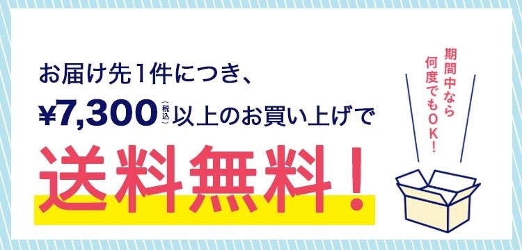 お届け先1件につき、商品代金7,300円(税込)以上ご購入で、送料が無料となるキャンペーンを開催しています。期間中は何度でもご利用いただけます。この機会にぜひお買い物をお楽しみください。
