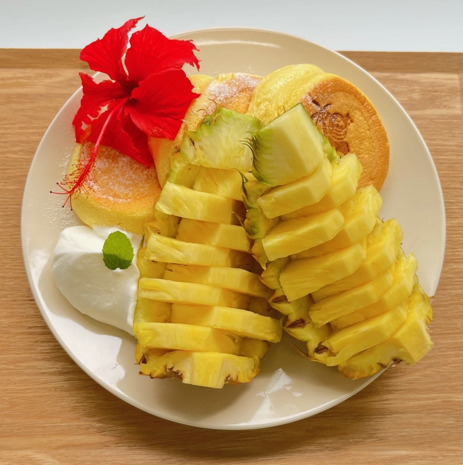 農家直送のもぎたて生フルーツをふんだんに使用した「生パイナップルパンケーキ」の販売を開始しました。旬の時期を迎えた絶品の石垣島産パイナップルは”ふわしゅわ”の生地と相性抜群!一度食べたら虜になること間違いなしの自慢の一品です♪