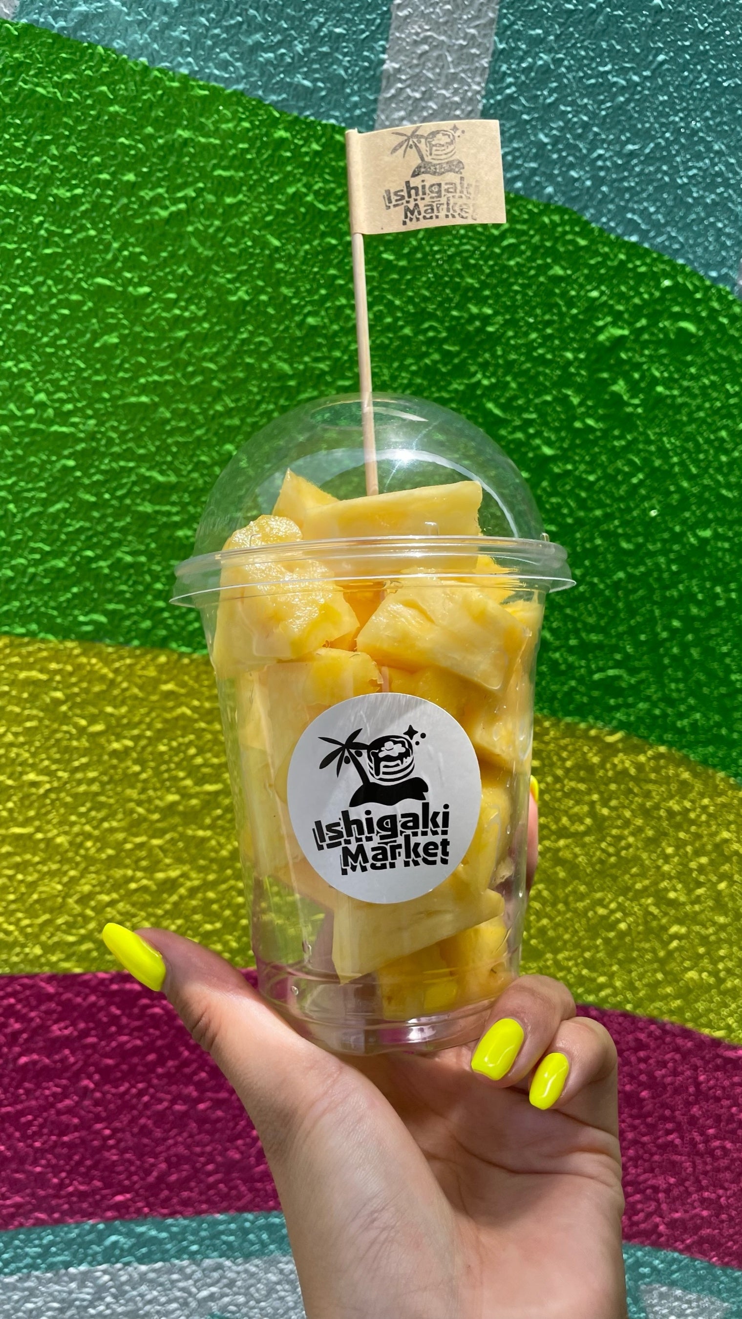 旬の時期限定販売!もぎたて生パイナップルのカットフルーツが新登場。パイナップル本来の甘さとみずみずしさをより感じられ、暑さが厳しくなるこの季節にピッタリの一品です。ドライブ中でも食べやすいように一口サイズにカットしたもぎたて生パイナップルを当店ロゴ入りのカップに入れて販売中。この季節しか味わえない貴重なパイナップルを是非お楽しみください。