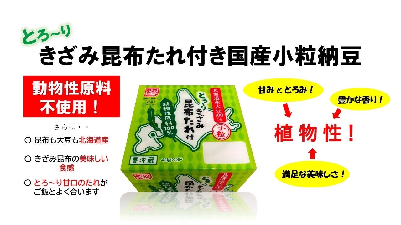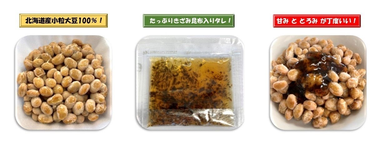 納豆の原料大豆は北海道産100%使用。たれは昆布の香り豊かなとろ~りきざみ昆布たれを添付しました。口に運んだ瞬間、昆布の甘みと旨みが口いっぱいに広がります。きざんだ昆布をたれに入れることにより昆布感もしっかり感じていただけるように仕上げました。たれにはとろみがあり、のど越しが良く、ご飯との相性も抜群です!