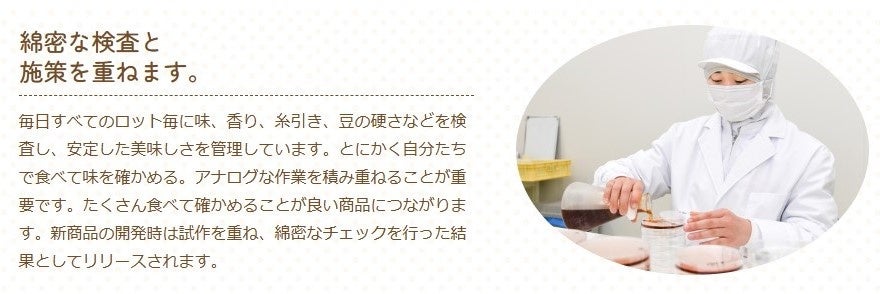 毎日すべてのロット毎に味・香り・糸引き・豆の硬さなどを検査し、安定した美味しさを管理しています。