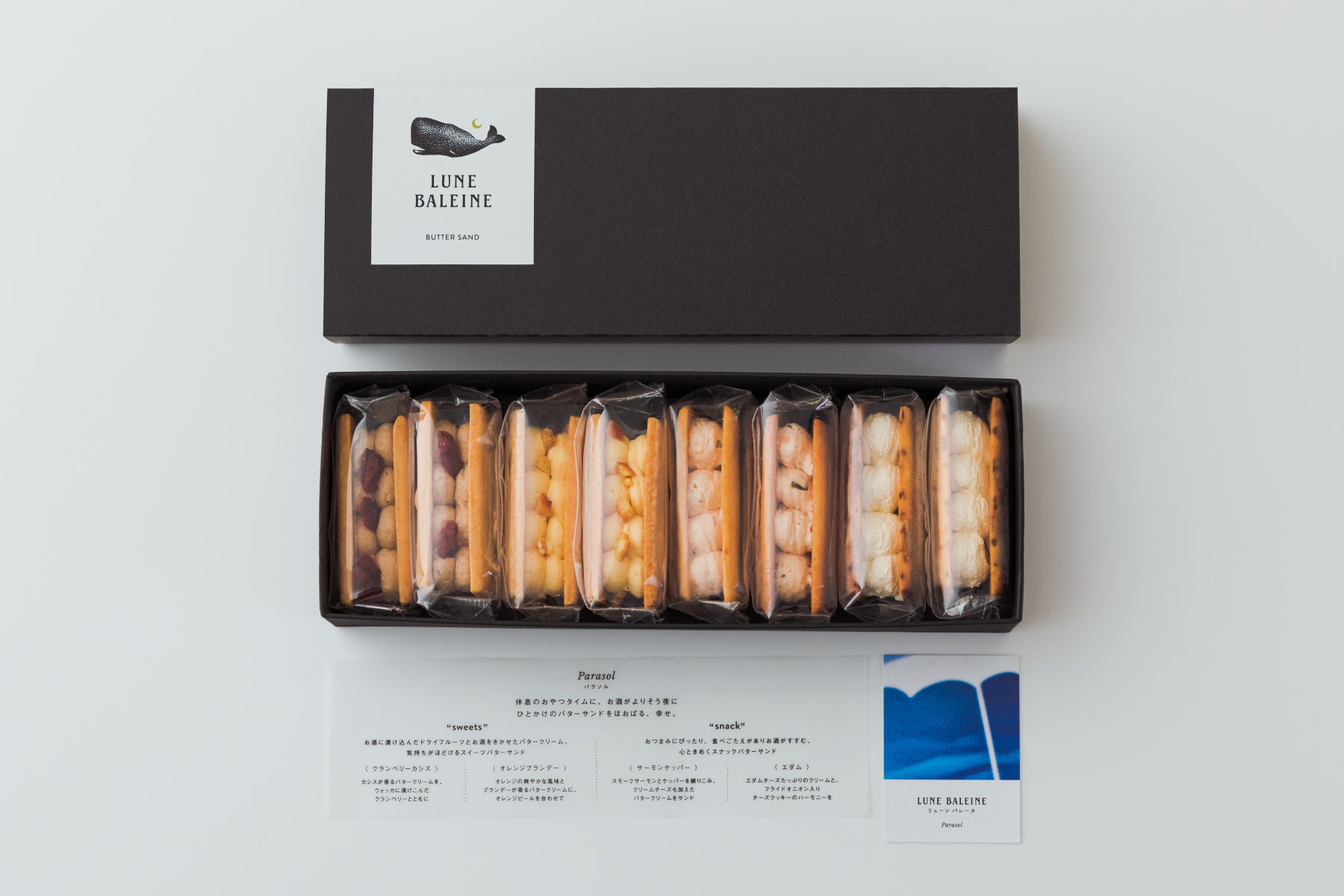 『LUNE BALEINE』は、“お酒を愉しむ“というコンセプトから生まれたバターサンドです。 “お酒を愉しむ“ゆるりとした時間を通して感じる、心も体もほぐれた“ほろ酔い“の感覚は、まるで水中で浮遊しているようなリラックス感があります。手のひらサイズのバターサンドに、神秘的で安らぎを感じられる、おおらかな鯨のイメージを重ね合わせることで「より豊かで特別な時間になりますように」という想いを込めています。
