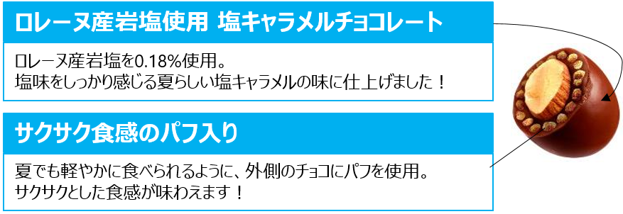 株式会社ロッテは6月13日(火)、キャラメルの甘さの中にロレーヌ産岩塩(*)の塩味がしっかりきいた、夏ならではのチョコレート「アーモンドチョコレート<塩とキャラメル>」を発売いたします。サクサクとした軽やかなパフを練り込み、アーモンドのカリッとした歯ごたえと合わせて2つの食感が楽しめます。塩とキャラメルの味わい、サクサクパフとアーモンドの食感が一体となった絶妙なおいしさをお楽しみください。 * ロレーヌ産岩塩0.18%使用