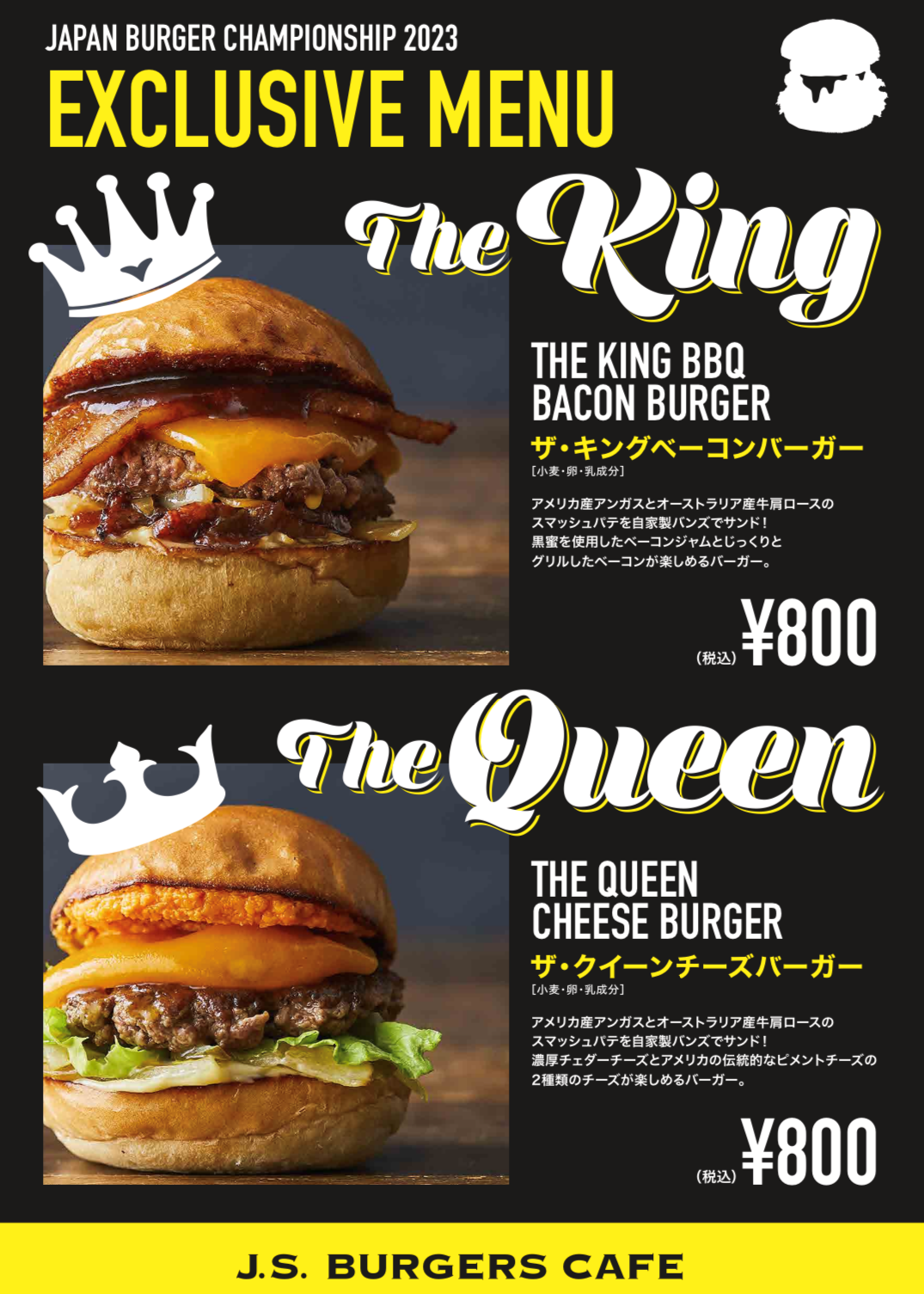■販売ブース概要 期間:2023年6月9日(金)~11日(日)※雨天決行(荒天候時は中止) 6月9日・10日 11:00~20:00(閉場21:00) 6月11日 11:00~17:00(閉場18:00) 場所 :横浜赤レンガ倉庫 (神奈川県横浜市中区新港1-1) 入場料 :無料(※飲食は有料となります。) J.S. BURGERS CAFE 販売商品 : ・ザ・キングベーコンチーズバーガー 税込800円 ・ザ・クイーンチーズバーガー 税込800円 ・予選対戦 提供バーガー 税込2,000円 ※限定10個 URL :https://jbc.plateitup.tokyo 主催 :Japan Burger Championship実行委員会 |